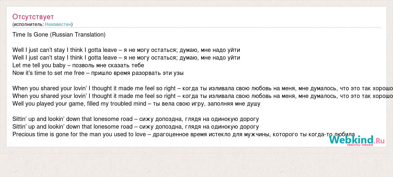 Time Is Gone [bad word] Translation) Well I just can’t stay I think I gotta leave – я не могу остаться; думаю, мне надо уйти Well I just can’t stay I think I gotta leave – я не могу остаться; думаю, мне надо уйти Let me tell you baby – позволь мне сказать тебе Now it’s time to set me free – пришло время разорвать эти узы When you shared your lovin’ I thought it made me feel so right – когда ты изливала свою любовь на меня, мне думалось, что это так хорошо When you shared your lovin’ I thought it made me feel so right – когда ты изливала свою любовь на меня, мне думалось, что это так хорошо Well you played your game, filled my troubled mind – ты вела свою игру, заполняя мне душу Sittin’ up and lookin’ down that lonesome road – сижу допоздна, глядя на одинокую дорогу Sittin’ up and lookin’ down that lonesome road – сижу допоздна, глядя на одинокую дорогу Precious time is gone for the man you used to love – драгоценное время истекло для мужчины, которого ты когда-то любила