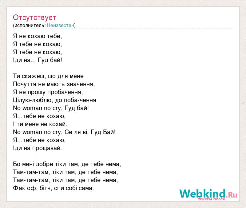 Я не кохаю тебе, Я тебе не кохаю, Я тебе не кохаю, Іди на... Гуд бай! Ти скажеш, що для мене Почуття не мають значення, Я не прошу пробачення, Цілую-люблю, до поба-чення No woman no cry, Гуд бай! Я...тебе не кохаю, І ти мене не кохай. No woman no cry, Се ля ві, Гуд Бай! Я...тебе не кохаю, Іди на прощавай. Бо мені добре тіки там, де тебе нема, Там-там-там, тіки там, де тебе нема, Там-там-там, тіки там, де тебе нема, Фак оф, бітч, спи собі сама.