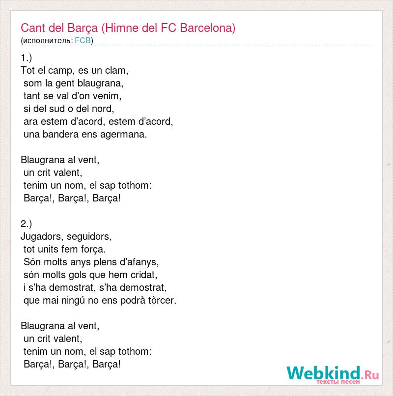 1.) Tot el camp, es un clam, som la gent blaugrana, tant se val d’on venim, si del sud o del nord, ara estem d’acord, estem d’acord, una bandera ens agermana. Blaugrana al vent, un crit valent, tenim un nom, el sap tothom: Barça!, Barça!, Barça! 2.) Jugadors, seguidors, tot units fem força. Són molts anys plens d’afanys, són molts gols que hem cridat, i s’ha demostrat, s’ha demostrat, que mai ningú no ens podrà tòrcer. Blaugrana al vent, un crit valent, tenim un nom, el sap tothom: Barça!, Barça!, Barça!