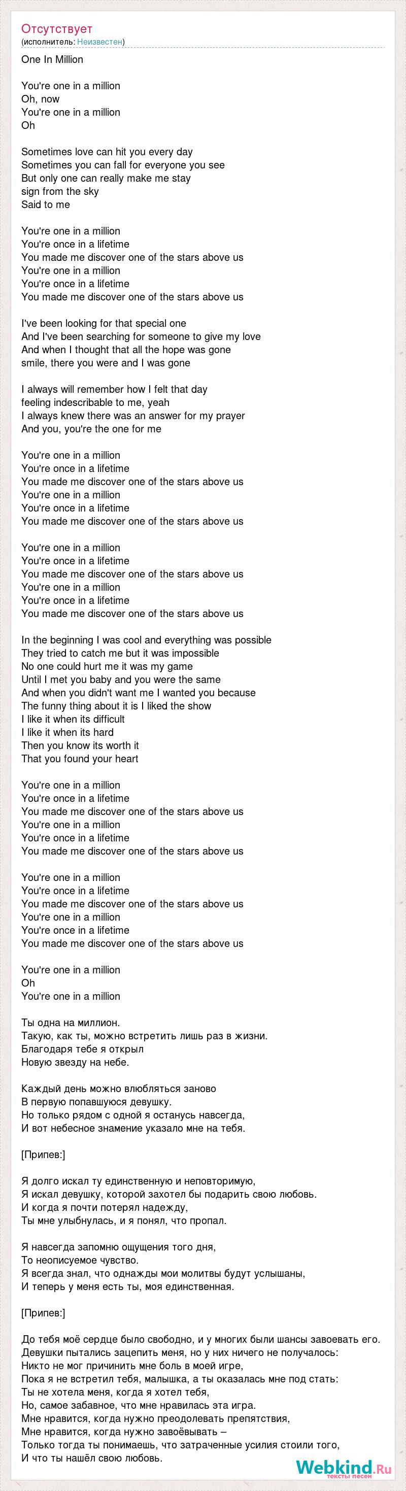 One In Million You're one in a million Oh, now You're one in a million Oh Sometimes love can hit you every day Sometimes you can fall for everyone you see But only one can really make me stay sign from the sky Said to me You're one in a million You're once in a lifetime You made me discover one of the stars above us You're one in a million You're once in a lifetime You made me discover one of the stars above us I've been looking for that special one And I've been searching for someone to give my love And when I thought that all the hope was gone smile, there you were and I was gone I always will remember how I felt that day feeling indescribable to me, yeah I always knew there was an answer for my prayer And you, you're the one for me You're one in a million You're once in a lifetime You made me discover one of the stars above us You're one in a million You're once in a lifetime You made me discover one of the stars above us You're one in a million You're once in a lifetime You made me discover one of the stars above us You're one in a million You're once in a lifetime You made me discover one of the stars above us In the beginning I was cool and everything was possible They tried to catch me but it was impossible No one could hurt me it was my game Until I met you baby and you were the same And when you didn't want me I wanted you because The funny thing about it is I liked the show I like it when its difficult I like it when its hard Then you know its worth it That you found your heart You're one in a million You're once in a lifetime You made me discover one of the stars above us You're one in a million You're once in a lifetime You made me discover one of the stars above us You're one in a million You're once in a lifetime You made me discover one of the stars above us You're one in a million You're once in a lifetime You made me discover one of the stars above us You're one in a million Oh You're one in a million Ты одна на миллион. Такую, как ты, можно встретить лишь раз в жизни. Благодаря тебе я открыл Новую звезду на небе. Каждый день можно влюбляться заново В первую попавшуюся девушку. Но только рядом с одной я останусь навсегда, И вот небесное знамение указало мне на тебя. [Припев:] Я долго искал ту единственную и неповторимую, Я искал девушку, которой захотел бы подарить свою любовь. И когда я почти потерял надежду, Ты мне улыбнулась, и я понял, что пропал. Я навсегда запомню ощущения того дня, То неописуемое чувство. Я всегда знал, что однажды мои молитвы будут услышаны, И теперь у меня есть ты, моя единственная. [Припев:] До тебя моё сердце было свободно, и у многих были шансы завоевать его. Девушки пытались зацепить меня, но у них ничего не получалось: Никто не мог причинить мне боль в моей игре, Пока я не встретил тебя, малышка, а ты оказалась мне под стать: Ты не хотела меня, когда я хотел тебя, Но, самое забавное, что мне нравилась эта игра. Мне нравится, когда нужно преодолевать препятствия, Мне нравится, когда нужно завоёвывать – Только тогда ты понимаешь, что затраченные усилия стоили того, И что ты нашёл свою любовь.