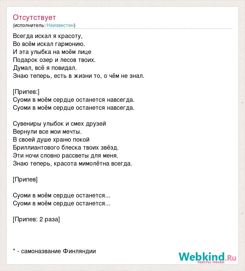 Всегда искал я красоту, Во всём искал гармонию. И эта улыбка на моём лице Подарок озер и лесов твоих. Думал, всё я повидал. Знаю теперь, есть в жизни то, о чём не знал. [Припев:] Суоми в моём сердце останется навсегда. Суоми в моём сердце останется навсегда. Сувениры улыбок и смех друзей Вернули все мои мечты. В своей душе храню покой Бриллиантового блеска твоих звёзд. Эти ночи словно рассветы для меня. Знаю теперь, красота мимолётна всегда. [Припев] Суоми в моём сердце останется... Суоми в моём сердце останется... [Припев: 2 раза] * - самоназвание Финляндии