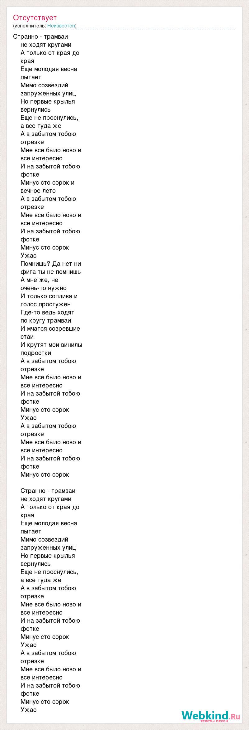Странно - трамваи не ходят кругами А только от края до края Еще молодая весна пытает Мимо созвездий запруженных улиц Но первые крылья вернулись Еще не проснулись, а все туда же А в забытом тобою отрезке Мне все было ново и все интересно И на забытой тобою фотке Минус сто сорок и вечное лето А в забытом тобою отрезке Мне все было ново и все интересно И на забытой тобою фотке Минус сто сорок Ужас Помнишь? Да нет ни фига ты не помнишь А мне же, не очень-то нужно И только соплива и голос простужен Где-то ведь ходят по кругу трамваи И мчатся созревшие стаи И крутят мои винилы подростки А в забытом тобою отрезке Мне все было ново и все интересно И на забытой тобою фотке Минус сто сорок Ужас А в забытом тобою отрезке Мне все было ново и все интересно И на забытой тобою фотке Минус сто сорок Странно - трамваи не ходят кругами А только от края до края Еще молодая весна пытает Мимо созвездий запруженных улиц Но первые крылья вернулись Еще не проснулись, а все туда же А в забытом тобою отрезке Мне все было ново и все интересно И на забытой тобою фотке Минус сто сорок Ужас А в забытом тобою отрезке Мне все было ново и все интересно И на забытой тобою фотке Минус сто сорок Ужас