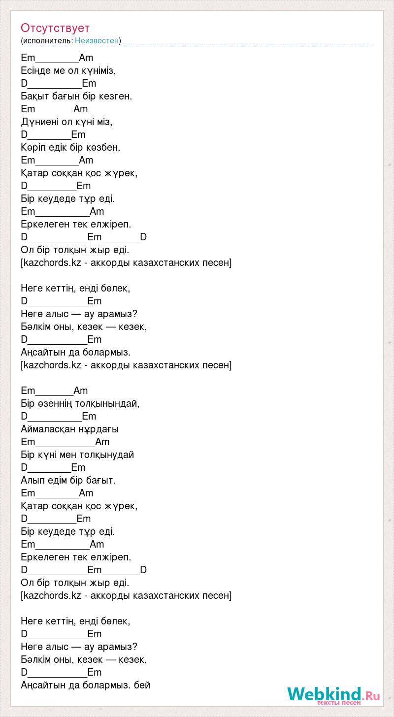 Em________Am Есіңде ме ол күніміз, D__________Em Бақыт бағын бір кезген. Em_______Am Дүниені ол күні міз, D________Em Көріп едік бір көзбен. Em________Am Қатар соққан қос жүрек, D_________Em Бір кеудеде тұр еді. Em__________Am Еркелеген тек елжіреп. D___________Em_______D Ол бір толқын жыр еді. [kazchords.kz - аккорды казахстанских песен] Неге кеттің, енді бөлек, D___________Em Неге алыс — ау арамыз? Бәлкім оны, кезек — кезек, D___________Em Аңсайтын да болармыз. [kazchords.kz - аккорды казахстанских песен] Em_______Am Бір өзеннің толқынындай, D__________Em Аймаласқан нұрдағы Em___________Am Бір күні мен толқынудай D________Em Алып едім бір бағыт. Em________Am Қатар соққан қос жүрек, D_________Em Бір кеудеде тұр еді. Em__________Am Еркелеген тек елжіреп. D___________Em_______D Ол бір толқын жыр еді. [kazchords.kz - аккорды казахстанских песен] Неге кеттің, енді бөлек, D___________Em Неге алыс — ау арамыз? Бәлкім оны, кезек — кезек, D___________Em Аңсайтын да болармыз. бей