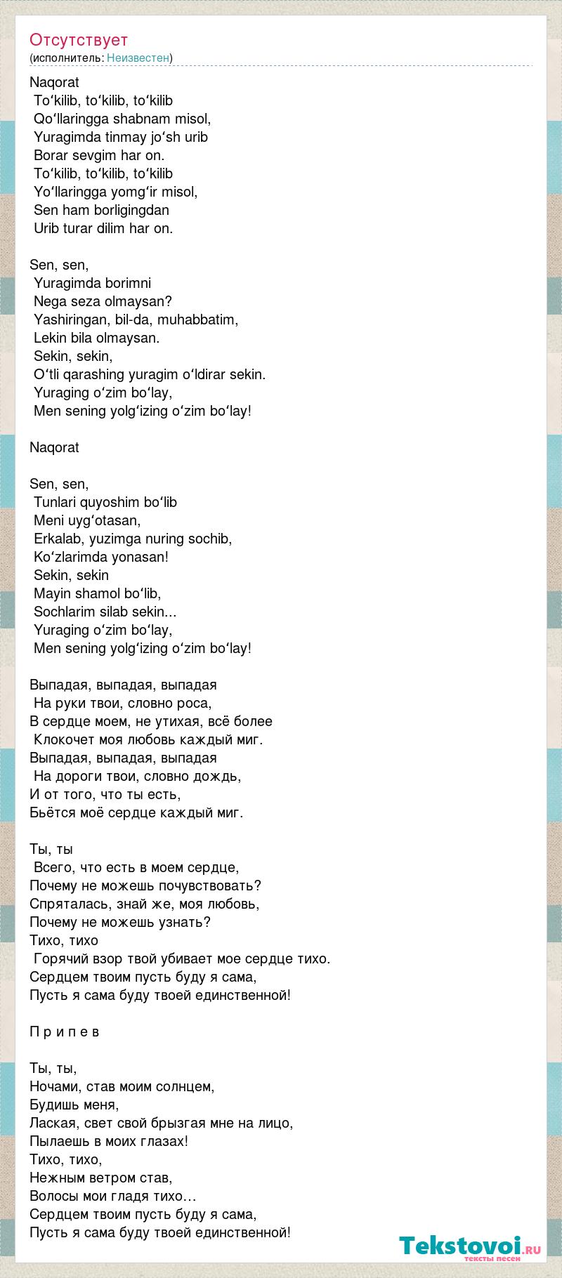 Naqorat Toʻkilib, toʻkilib, toʻkilib Qoʻllaringga shabnam misol, Yuragimda tinmay joʻsh urib Borar sevgim har on. Toʻkilib, toʻkilib, toʻkilib Yoʻllaringga yomgʻir misol, Sen ham borligingdan Urib turar dilim har on. Sen, sen, Yuragimda borimni Nega seza olmaysan? Yashiringan, bil-da, muhabbatim, Lekin bila olmaysan. Sekin, sekin, Oʻtli qarashing yuragim oʻldirar sekin. Yuraging oʻzim boʻlay, Men sening yolgʻizing oʻzim boʻlay! Naqorat Sen, sen, Tunlari quyoshim boʻlib Meni uygʻotasan, Erkalab, yuzimga nuring sochib, Koʻzlarimda yonasan! Sekin, sekin Mayin shamol boʻlib, Sochlarim silab sekin... Yuraging oʻzim boʻlay, Men sening yolgʻizing oʻzim boʻlay! Выпадая, выпадая, выпадая На руки твои, словно роса, В сердце моем, не утихая, всё более Клокочет моя любовь каждый миг. Выпадая, выпадая, выпадая На дороги твои, словно дождь, И от того, что ты есть, Бьётся моё сердце каждый миг. Ты, ты Всего, что есть в моем сердце, Почему не можешь почувствовать? Спряталась, знай же, моя любовь, Почему не можешь узнать? Тихо, тихо Горячий взор твой убивает мое сердце тихо. Сердцем твоим пусть буду я сама, Пусть я сама буду твоей единственной! П р и п е в Ты, ты, Ночами, став моим солнцем, Будишь меня, Лаская, свет свой брызгая мне на лицо, Пылаешь в моих глазах! Тихо, тихо, Нежным ветром став, Волосы мои гладя тихо… Сердцем твоим пусть буду я сама, Пусть я сама буду твоей единственной!
