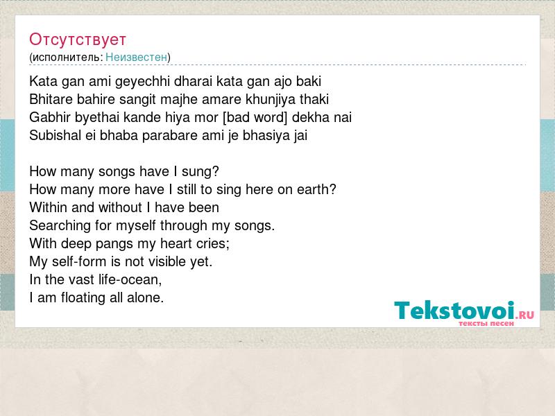 Kata gan ami geyechhi dharai kata gan ajo baki Bhitare bahire sangit majhe amare khunjiya thaki Gabhir byethai kande hiya mor [bad word] dekha nai Subishal ei bhaba parabare ami je bhasiya jai How many songs have I sung? How many more have I still to sing here on earth? Within and without I have been Searching for myself through my songs. With deep pangs my heart cries; My self-form is not visible yet. In the vast life-ocean, I am floating all alone.