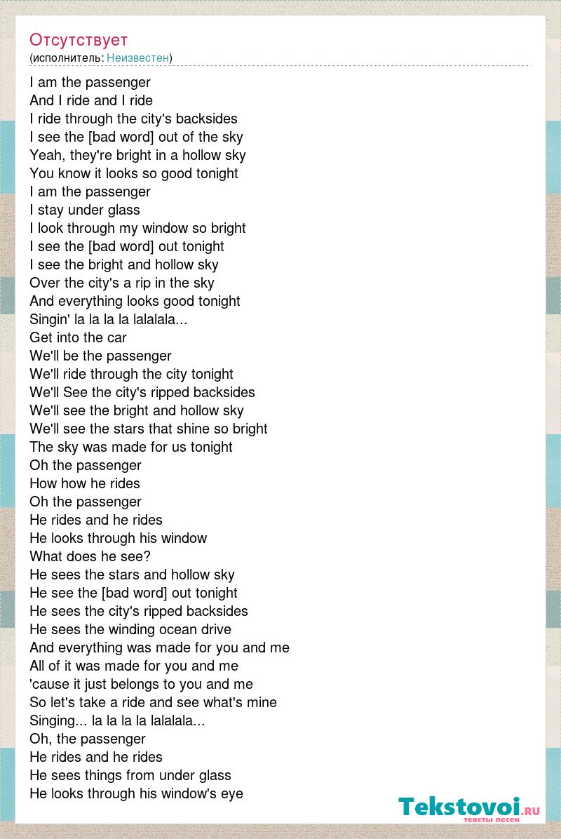 I am the passenger And I ride and I ride I ride through the city's backsides I see the [bad word] out of the sky Yeah, they're bright in a hollow sky You know it looks so good tonight I am the passenger I stay under glass I look through my window so bright I see the [bad word] out tonight I see the bright and hollow sky Over the city's a rip in the sky And everything looks good tonight Singin' la la la la lalalala... Get into the car We'll be the passenger We'll ride through the city tonight We'll See the city's ripped backsides We'll see the bright and hollow sky We'll see the stars that shine so bright The sky was made for us tonight Oh the passenger How how he rides Oh the passenger He rides and he rides He looks through his window What does he see? He sees the stars and hollow sky He see the [bad word] out tonight He sees the city's ripped backsides He sees the winding ocean drive And everything was made for you and me All of it was made for you and me 'cause it just belongs to you and me So let's take a ride and see what's mine Singing... la la la la lalalala... Oh, the passenger He rides and he rides He sees things from under glass He looks through his window's eye