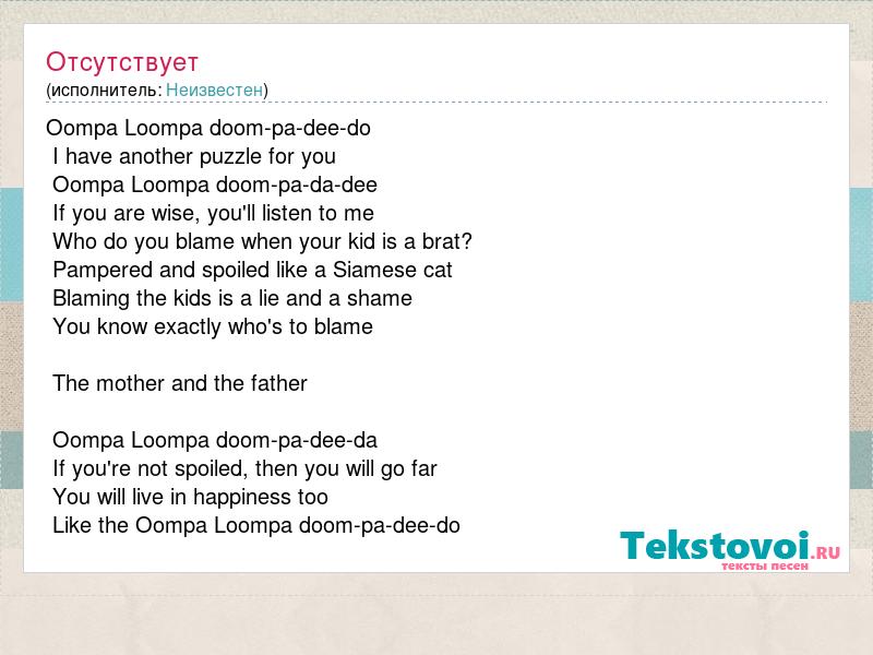 Oompa Loompa doom-pa-dee-do I have another puzzle for you Oompa Loompa doom-pa-da-dee If you are wise, you'll listen to me Who do you blame when your kid is a brat? Pampered and spoiled like a Siamese cat Blaming the kids is a lie and a shame You know exactly who's to blame The mother and the father Oompa Loompa doom-pa-dee-da If you're not spoiled, then you will go far You will live in happiness too Like the Oompa Loompa doom-pa-dee-do