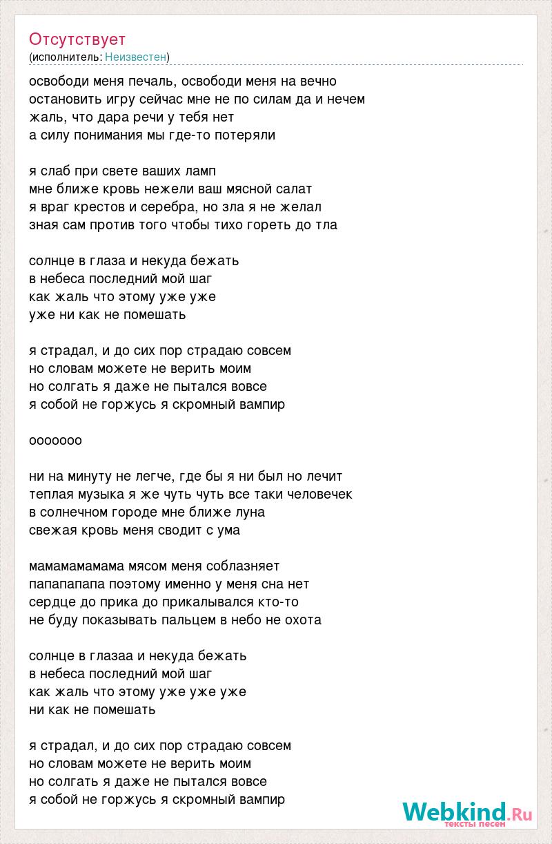освободи меня печаль, освободи меня на вечно остановить игру сейчас мне не по силам да и нечем жаль, что дара речи у тебя нет а силу понимания мы где-то потеряли я слаб при свете ваших ламп мне ближе кровь нежели ваш мясной салат я враг крестов и серебра, но зла я не желал зная сам против того чтобы тихо гореть до тла солнце в глаза и некуда бежать в небеса последний мой шаг как жаль что этому уже уже уже ни как не помешать я страдал, и до сих пор страдаю совсем но словам можете не верить моим но солгать я даже не пытался вовсе я собой не горжусь я скромный вампир ооооооо ни на минуту не легче, где бы я ни был но лечит теплая музыка я же чуть чуть все таки человечек в солнечном городе мне ближе луна свежая кровь меня сводит с ума мамамамамама мясом меня соблазняет папапапапа поэтому именно у меня сна нет сердце до прика до прикалывался кто-то не буду показывать пальцем в небо не охота солнце в глазаа и некуда бежать в небеса последний мой шаг как жаль что этому уже уже уже ни как не помешать я страдал, и до сих пор страдаю совсем но словам можете не верить моим но солгать я даже не пытался вовсе я собой не горжусь я скромный вампир