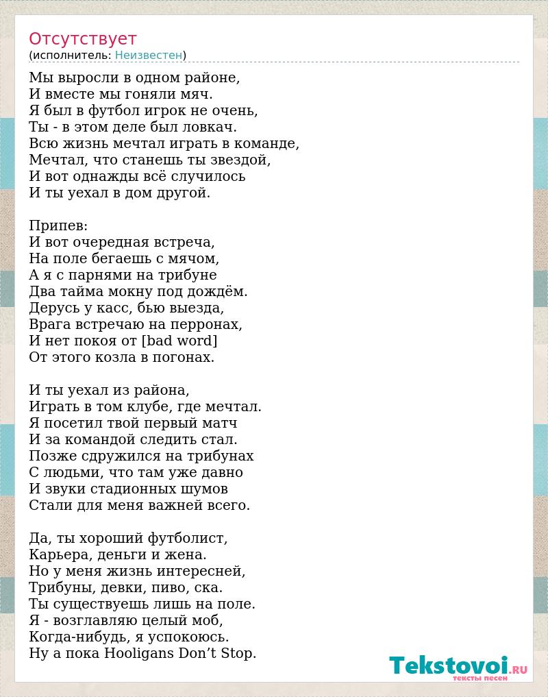 Мы выросли в одном районе, И вместе мы гоняли мяч. Я был в футбол игрок не очень, Ты - в этом деле был ловкач. Всю жизнь мечтал играть в команде, Мечтал, что станешь ты звездой, И вот однажды всё случилось И ты уехал в дом другой. Припев: И вот очередная встреча, На поле бегаешь с мячом, А я с парнями на трибуне Два тайма мокну под дождём. Дерусь у касс, бью выезда, Врага встречаю на перронах, И нет покоя от [bad word] От этого козла в погонах. И ты уехал из района, Играть в том клубе, где мечтал. Я посетил твой первый матч И за командой следить стал. Позже сдружился на трибунах С людьми, что там уже давно И звуки стадионных шумов Стали для меня важней всего. Да, ты хороший футболист, Карьера, деньги и жена. Но у меня жизнь интересней, Трибуны, девки, пиво, ска. Ты существуешь лишь на поле. Я - возглавляю целый моб, Когда-нибудь, я успокоюсь. Ну а пока Hooligans Don’t Stop.