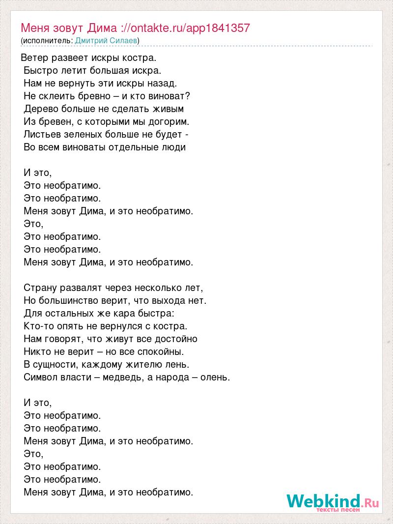 Ветер развеет искры костра. Быстро летит большая искра. Нам не вернуть эти искры назад. Не склеить бревно – и кто виноват? Дерево больше не сделать живым Из бревен, с которыми мы догорим. Листьев зеленых больше не будет - Во всем виноваты отдельные люди И это, Это необратимо. Это необратимо. Меня зовут Дима, и это необратимо. Это, Это необратимо. Это необратимо. Меня зовут Дима, и это необратимо. Страну развалят через несколько лет, Но большинство верит, что выхода нет. Для остальных же кара быстра: Кто-то опять не вернулся с костра. Нам говорят, что живут все достойно Никто не верит – но все спокойны. В сущности, каждому жителю лень. Символ власти – медведь, а народа – олень. И это, Это необратимо. Это необратимо. Меня зовут Дима, и это необратимо. Это, Это необратимо. Это необратимо. Меня зовут Дима, и это необратимо.