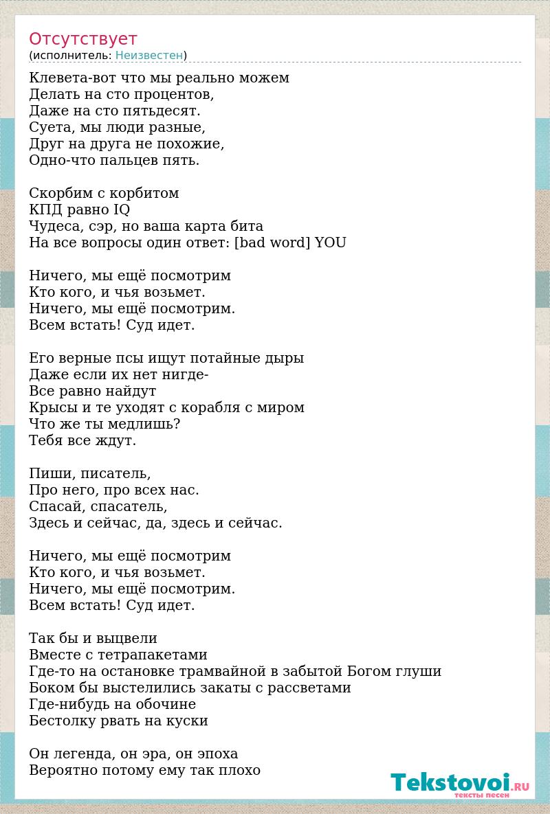 Клевета-вот что мы реально можем Делать на сто процентов, Даже на сто пятьдесят. Суета, мы люди разные, Друг на друга не похожие, Одно-что пальцев пять. Скорбим с корбитом КПД равно IQ Чудеса, сэр, но ваша карта бита На все вопросы один ответ: [bad word] YOU Ничего, мы ещё посмотрим Кто кого, и чья возьмет. Ничего, мы ещё посмотрим. Всем встать! Суд идет. Его верные псы ищут потайные дыры Даже если их нет нигде- Все равно найдут Крысы и те уходят с корабля с миром Что же ты медлишь? Тебя все ждут. Пиши, писатель, Про него, про всех нас. Спасай, спасатель, Здесь и сейчас, да, здесь и сейчас. Ничего, мы ещё посмотрим Кто кого, и чья возьмет. Ничего, мы ещё посмотрим. Всем встать! Суд идет. Так бы и выцвели Вместе с тетрапакетами Где-то на остановке трамвайной в забытой Богом глуши Боком бы выстелились закаты с рассветами Где-нибудь на обочине Бестолку рвать на куски Он легенда, он эра, он эпоха Вероятно потому ему так плохо