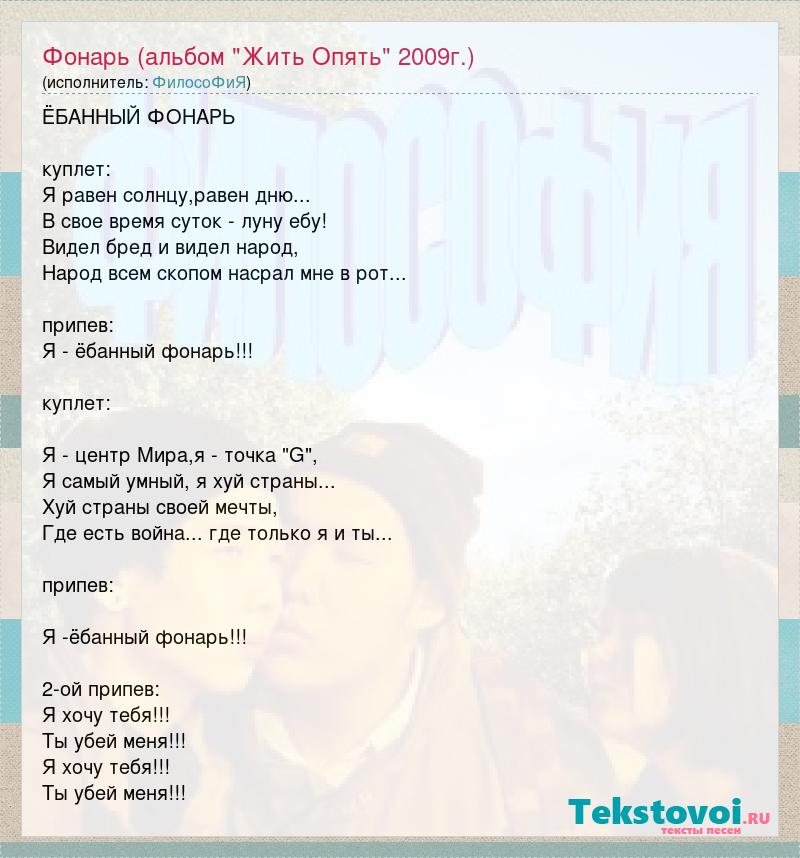 ЁБАННЫЙ ФОНАРЬ куплет: Я равен солнцу,равен дню... В свое время суток - луну ебу! Видел бред и видел народ, Народ всем скопом насрал мне в рот... припев: Я - ёбанный фонарь!!! куплет: Я - центр Мира,я - точка "G", Я самый умный, я хуй страны... Хуй страны своей мечты, Где есть война... где только я и ты... припев: Я -ёбанный фонарь!!! 2-ой припев: Я хочу тебя!!! Ты убей меня!!! Я хочу тебя!!! Ты убей меня!!!