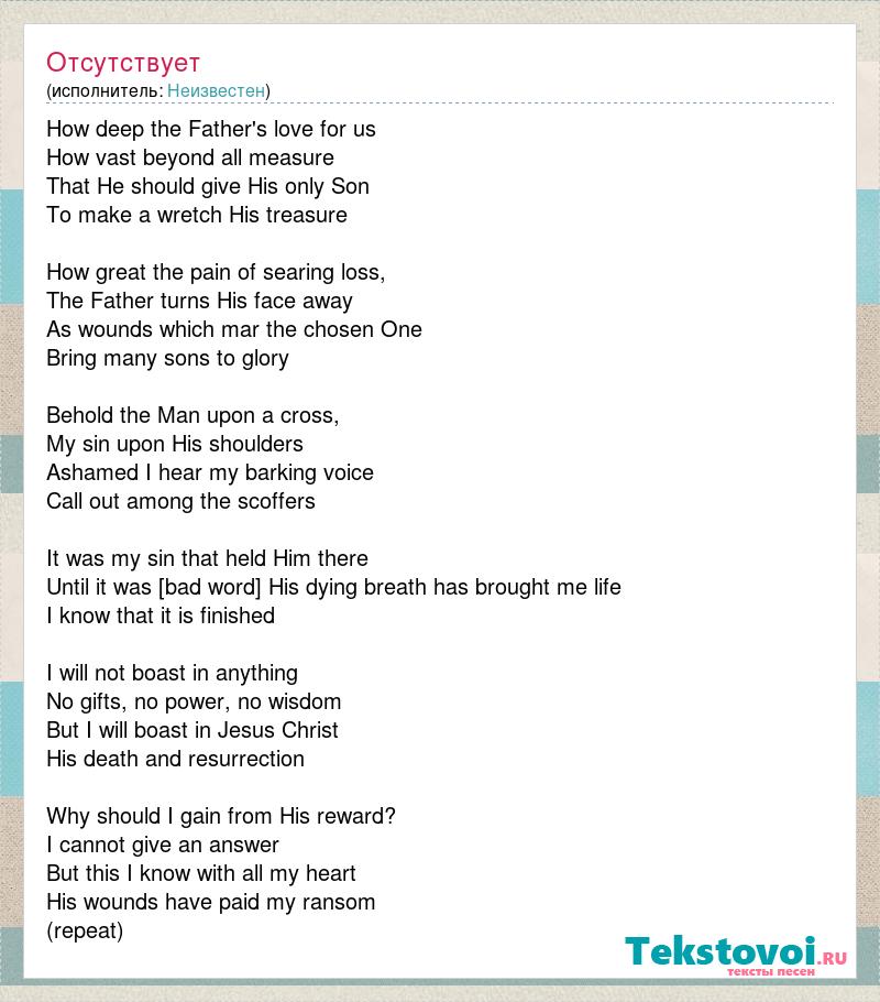 How deep the Father's love for us How vast beyond all measure That He should give His only Son To make a wretch His treasure How great the pain of searing loss, The Father turns His face away As wounds which mar the chosen One Bring many sons to glory Behold the Man upon a cross, My sin upon His shoulders Ashamed I hear my barking voice Call out among the scoffers It was my sin that held Him there Until it was [bad word] His dying breath has brought me life I know that it is finished I will not boast in anything No gifts, no power, no wisdom But I will boast in Jesus Christ His death and resurrection Why should I gain from His reward? I cannot give an answer But this I know with all my heart His wounds have paid my ransom (repeat)