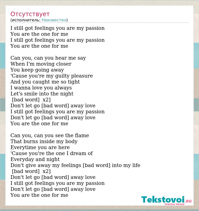 I still got feelings you are my passion You are the one for me I still got feelings you are my passion You are the one for me Can you, can you hear me say When I'm moving closer You keep going away 'Cause you're my guilty pleasure And you caught me so tight I wanna love you always Let's smile into the night [bad word] x2] Don't let go [bad word] away love I still got feelings you are my passion Don't let go [bad word] away love You are the one for me Can you, can you see the flame That burns inside my body Everytime you are here 'Cause you're the one I dream of Everyday and night Don't give away my feelings [bad word] into my life [bad word] x2] Don't let go [bad word] away love I still got feelings you are my passion Don't let go [bad word] away love You are the one for me