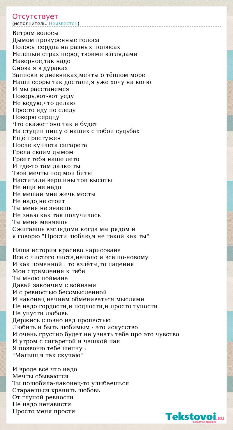 Ветром волосы Дымом прокуренные голоса Полосы сердца на разных полюсах Нелепый страх перед твоими взглядами Наверное,так надо Снова я в дураках Записки в дневниках,мечты о тёплом море Наши ссоры так достали,я уже хочу на волю И мы расстанемся Поверь,вот-вот уеду Не ведую,что делаю Просто иду по следу Поверю сердцу Что скажет оно так и будет На студии пишу о наших с тобой судьбах Ещё простужен После куплета сигарета Грела своим дымом Греет тебя наше лето И где-то там далко ты Твои мечты под мои биты Настигали вершины той высоты Не ищи не надо Не мешай мне жечь мосты Не надо,не стоит Ты меня не знаешь Не знаю как так получилось Ты меня меняешь Сжигаешь взглядоми когда мы рядом и я говорю "Прости люблю,я не такой как ты" Наша история красиво нарисована Всё с чистого листа,начало и всё по-новому И как ломанной : то взлёты,то падения Мои стремления к тебе Ты мною поймана Давай закончим с войнами И с ревностью бессмысленной И наконец начнём обмениваться мыслями Не надо гордости,и подлости,и просто тупости Не упусти любовь Держись словно над пропастью Любить и быть любимым - это искусство И очень грустно будет не узнать тебе про это чувство И утром с сигаретой и чашкой чая Я позвоню тебе шепну : "Малыш,я так скучаю" И вроде всё что надо Мечты сбываются Ты полюбила-наконец-то улыбаешься Стараешься хранить любовь От глупой ревности Не надо ненависти Просто меня прости