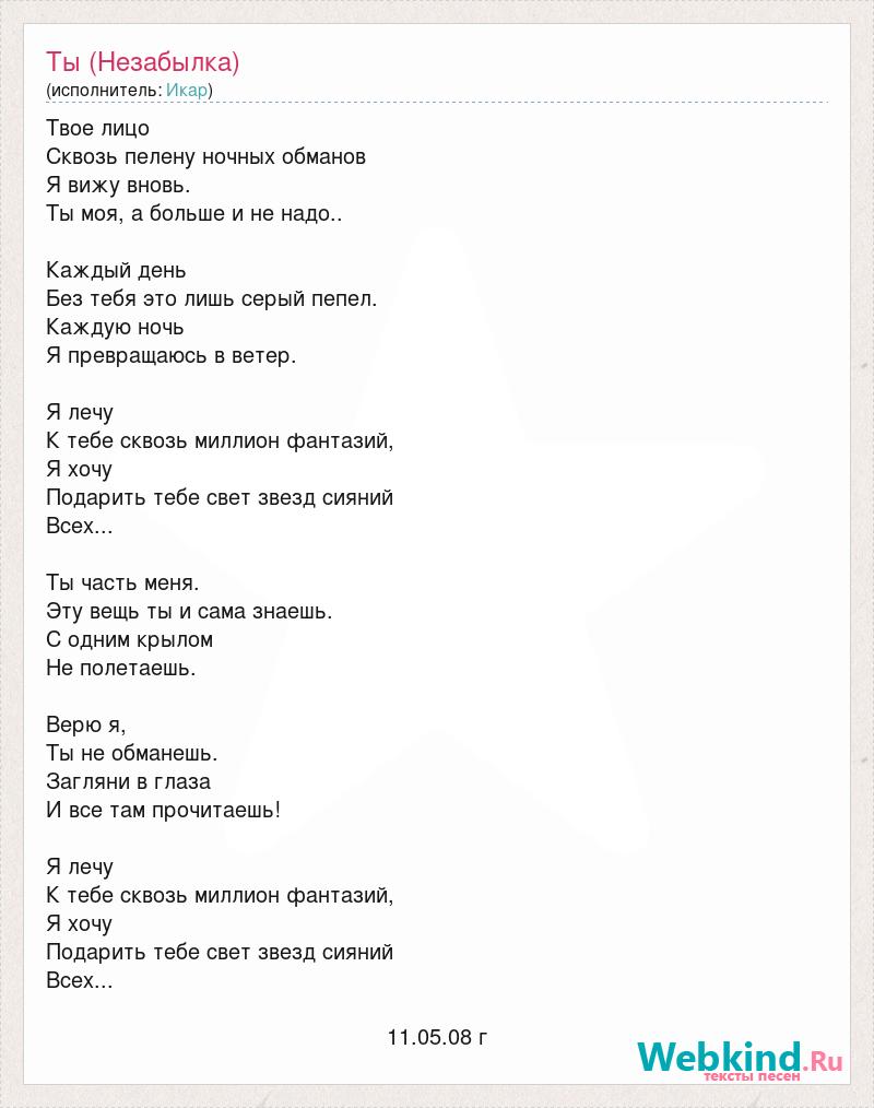 Твое лицо Сквозь пелену ночных обманов Я вижу вновь. Ты моя, а больше и не надо.. Каждый день Без тебя это лишь серый пепел. Каждую ночь Я превращаюсь в ветер. Я лечу К тебе сквозь миллион фантазий, Я хочу Подарить тебе свет звезд сияний Всех... Ты часть меня. Эту вещь ты и сама знаешь. С одним крылом Не полетаешь. Верю я, Ты не обманешь. Загляни в глаза И все там прочитаешь! Я лечу К тебе сквозь миллион фантазий, Я хочу Подарить тебе свет звезд сияний Всех... 11.05.08 г