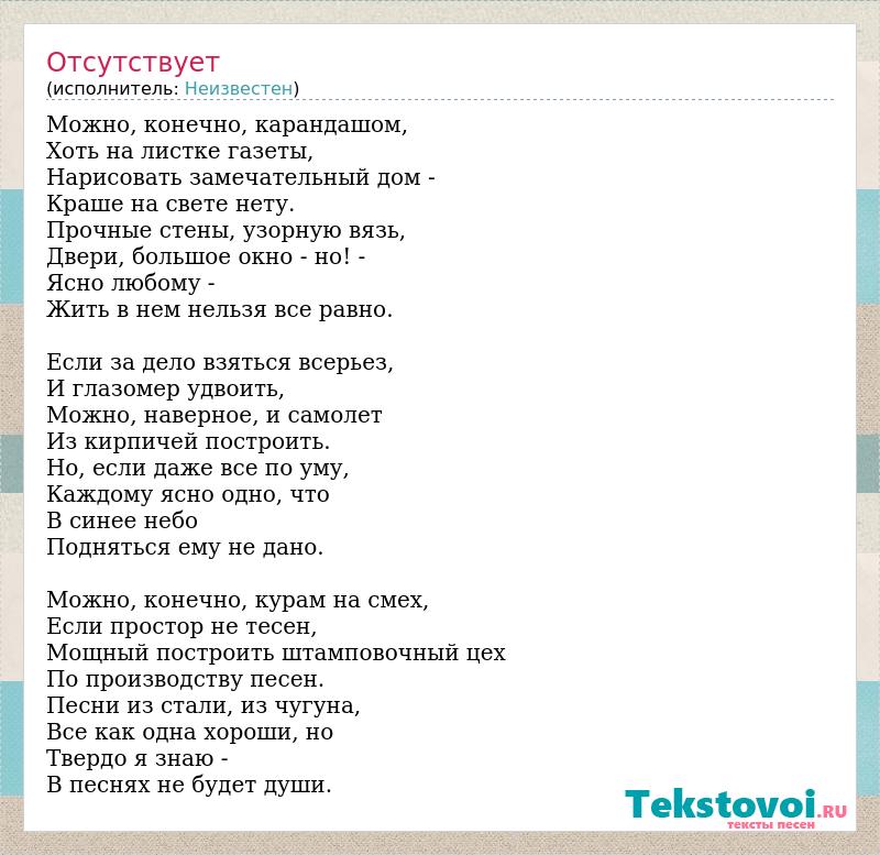 Можно, конечно, карандашом, Хоть на листке газеты, Нарисовать замечательный дом - Краше на свете нету. Прочные стены, узорную вязь, Двери, большое окно - но! - Ясно любому - Жить в нем нельзя все равно. Если за дело взяться всерьез, И глазомер удвоить, Можно, наверное, и самолет Из кирпичей построить. Но, если даже все по уму, Каждому ясно одно, что В синее небо Подняться ему не дано. Можно, конечно, курам на смех, Если простор не тесен, Мощный построить штамповочный цех По производству песен. Песни из стали, из чугуна, Все как одна хороши, но Твердо я знаю - В песнях не будет души.