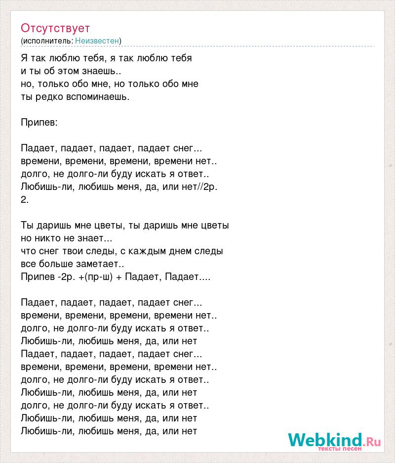 Я так люблю тебя, я так люблю тебя и ты об этом знаешь.. но, только обо мне, но только обо мне ты редко вспоминаешь. Припев: Падает, падает, падает, падает снег... времени, времени, времени, времени нет.. долго, не долго-ли буду искать я ответ.. Любишь-ли, любишь меня, да, или нет//2р. 2. Ты даришь мне цветы, ты даришь мне цветы но никто не знает... что снег твои следы, с каждым днем следы все больше заметает.. Припев -2р. +(пр-ш) + Падает, Падает.... Падает, падает, падает, падает снег... времени, времени, времени, времени нет.. долго, не долго-ли буду искать я ответ.. Любишь-ли, любишь меня, да, или нет Падает, падает, падает, падает снег... времени, времени, времени, времени нет.. долго, не долго-ли буду искать я ответ.. Любишь-ли, любишь меня, да, или нет долго, не долго-ли буду искать я ответ.. Любишь-ли, любишь меня, да, или нет Любишь-ли, любишь меня, да, или нет