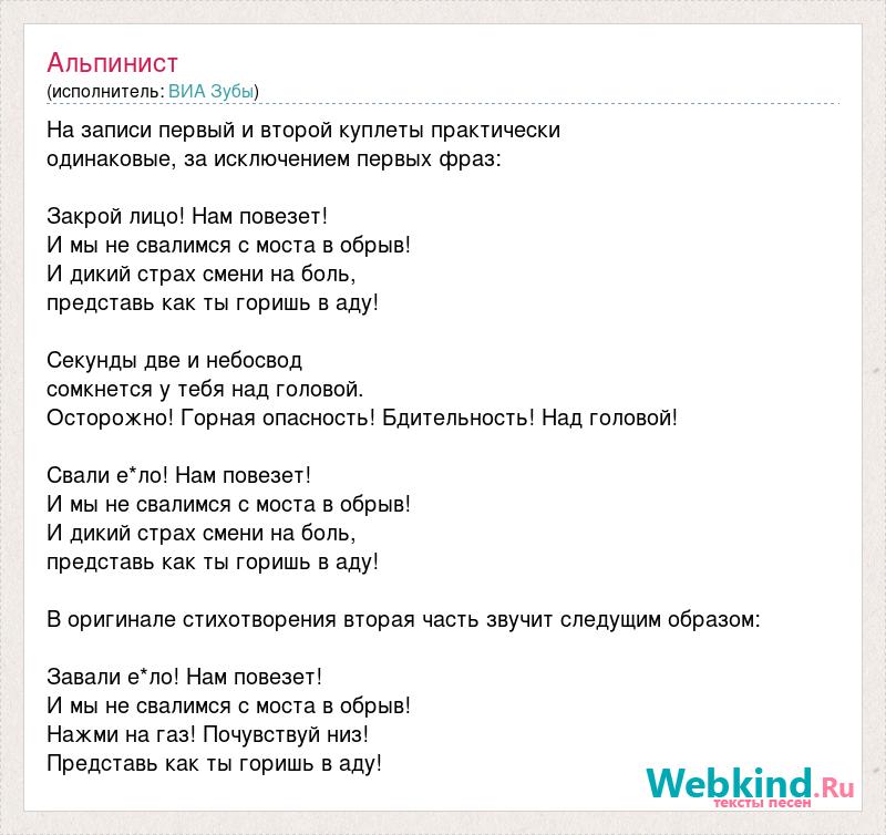 На записи первый и второй куплеты практически одинаковые, за исключением первых фраз: Закрой лицо! Нам повезет! И мы не свалимся с моста в обрыв! И дикий страх смени на боль, представь как ты горишь в аду! Секунды две и небосвод сомкнется у тебя над головой. Осторожно! Горная опасность! Бдительность! Над головой! Свали е*ло! Нам повезет! И мы не свалимся с моста в обрыв! И дикий страх смени на боль, представь как ты горишь в аду! В оригинале стихотворения вторая часть звучит следущим образом: Завали е*ло! Нам повезет! И мы не свалимся с моста в обрыв! Нажми на газ! Почувствуй низ! Представь как ты горишь в аду!
