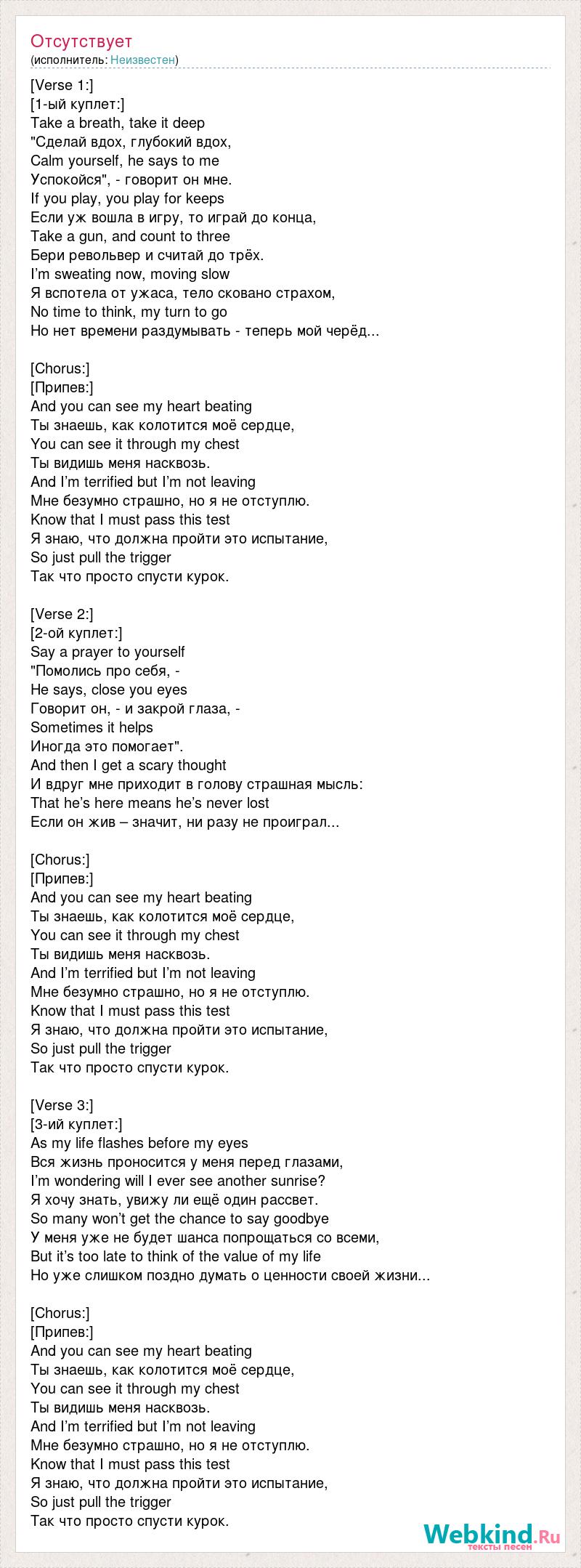 [Verse 1:] [1-ый куплет:] Take a breath, take it deep "Сделай вдох, глубокий вдох, Calm yourself, he says to me Успокойся", - говорит он мне. If you play, you play for keeps Если уж вошла в игру, то играй до конца, Take a gun, and count to three Бери револьвер и считай до трёх. I’m sweating now, moving slow Я вспотела от ужаса, тело сковано страхом, No time to think, my turn to go Но нет времени раздумывать - теперь мой черёд... [bad word] ] [Припев:] And you can see my heart beating Ты знаешь, как колотится моё сердце, You can see it through my chest Ты видишь меня насквозь. And I’m terrified but I’m not leaving Мне безумно страшно, но я не отступлю. Know that I must pass this test Я знаю, что должна пройти это испытание, So just pull the trigger Так что просто спусти курок. [Verse 2:] [2-ой куплет:] Say a prayer to yourself "Помолись про себя, - He says, close you eyes Говорит он, - и закрой глаза, - Sometimes it helps Иногда это помогает". And then I get a scary thought И вдруг мне приходит в голову страшная мысль: That he’s here means he’s never lost Если он жив – значит, ни разу не проиграл... [bad word] ] [Припев:] And you can see my heart beating Ты знаешь, как колотится моё сердце, You can see it through my chest Ты видишь меня насквозь. And I’m terrified but I’m not leaving Мне безумно страшно, но я не отступлю. Know that I must pass this test Я знаю, что должна пройти это испытание, So just pull the trigger Так что просто спусти курок. [Verse 3:] [3-ий куплет:] As my life flashes before my eyes Вся жизнь проносится у меня перед глазами, I’m wondering will I ever see another sunrise? Я хочу знать, увижу ли ещё один рассвет. So many won’t get the chance to say goodbye У меня уже не будет шанса попрощаться со всеми, But it’s too late to think of the value of my life Но уже слишком поздно думать о ценности своей жизни... [bad word] ] [Припев:] And you can see my heart beating Ты знаешь, как колотится моё сердце, You can see it through my chest Ты видишь меня насквозь. And I’m terrified but I’m not leaving Мне безумно страшно, но я не отступлю. Know that I must pass this test Я знаю, что должна пройти это испытание, So just pull the trigger Так что просто спусти курок.