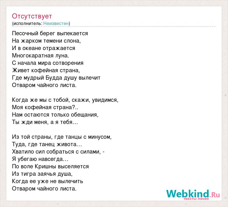 Песочный берег выпекается На жарком темени слона, И в океане отражается Многокаратная луна. С начала мира сотворения Живет кофейная страна, Где мудрый Будда душу вылечит Отваром чайного листа. Когда же мы с тобой, скажи, увидимся, Моя кофейная страна?.. Нам остаются только обещания, Ты жди меня, а я тебя… Из той страны, где танцы с минусом, Туда, где танец живота… Хватило сил собраться с силами, - Я убегаю навсегда… По воле Кришны выселяется Из тигра заячья душа, Когда ее уже не вылечить Отваром чайного листа.