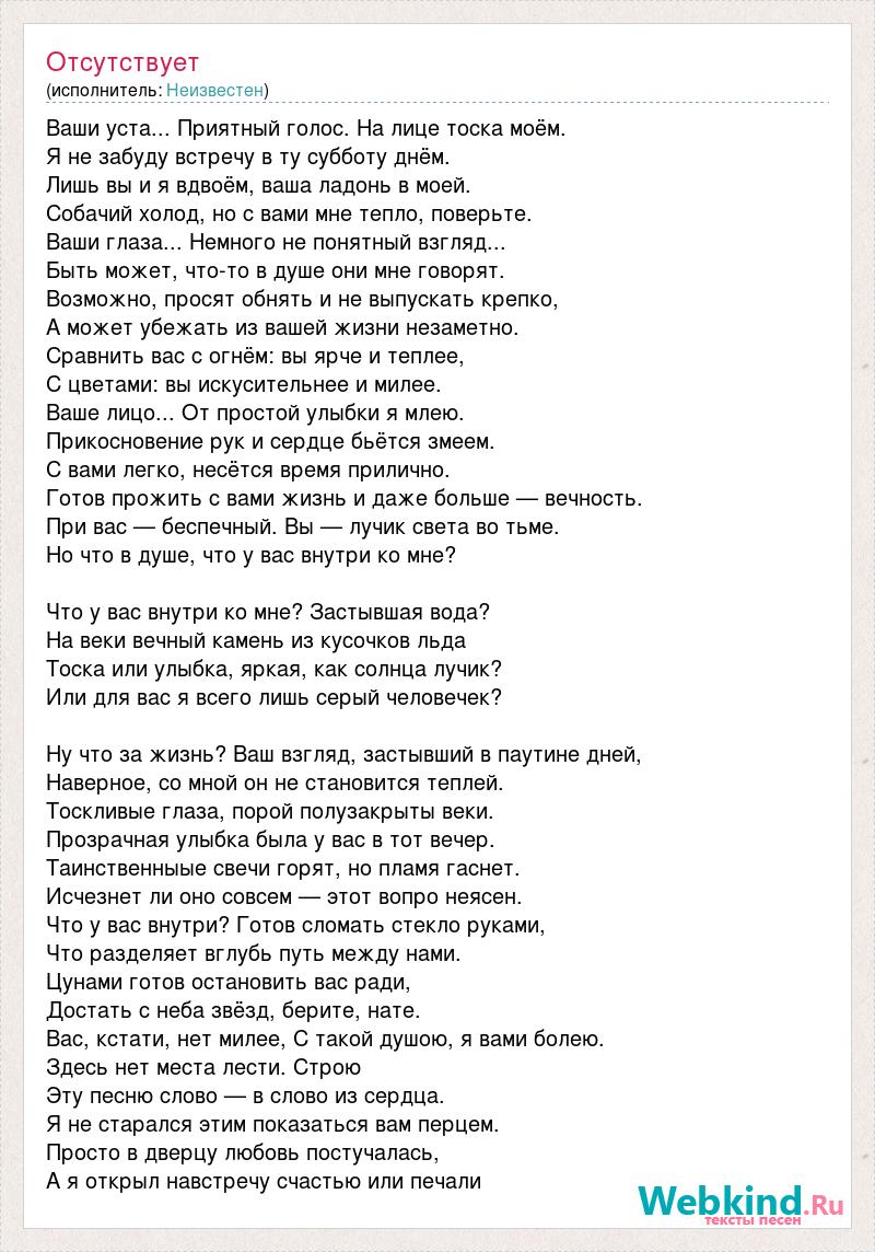 Ваши уста... Приятный голос. На лице тоска моём. Я не забуду встречу в ту субботу днём. Лишь вы и я вдвоём, ваша ладонь в моей. Собачий холод, но с вами мне тепло, поверьте. Ваши глаза... Немного не понятный взгляд... Быть может, что-то в душе они мне говорят. Возможно, просят обнять и не выпускать крепко, А может убежать из вашей жизни незаметно. Сравнить вас с огнём: вы ярче и теплее, С цветами: вы искусительнее и милее. Ваше лицо... От простой улыбки я млею. Прикосновение рук и сердце бьётся змеем. С вами легко, несётся время прилично. Готов прожить с вами жизнь и даже больше — вечность. При вас — беспечный. Вы — лучик света во тьме. Но что в душе, что у вас внутри ко мне? Что у вас внутри ко мне? Застывшая вода? На веки вечный камень из кусочков льда Тоска или улыбка, яркая, как солнца лучик? Или для вас я всего лишь серый человечек? Ну что за жизнь? Ваш взгляд, застывший в паутине дней, Наверное, со мной он не становится теплей. Тоскливые глаза, порой полузакрыты веки. Прозрачная улыбка была у вас в тот вечер. Таинственныые свечи горят, но пламя гаснет. Исчезнет ли оно совсем — этот вопро неясен. Что у вас внутри? Готов сломать стекло руками, Что разделяет вглубь путь между нами. Цунами готов остановить вас ради, Достать с неба звёзд, берите, нате. Вас, кстати, нет милее, С такой душою, я вами болею. Здесь нет места лести. Строю Эту песню слово — в слово из сердца. Я не старался этим показаться вам перцем. Просто в дверцу любовь постучалась, А я открыл навстречу счастью или печали