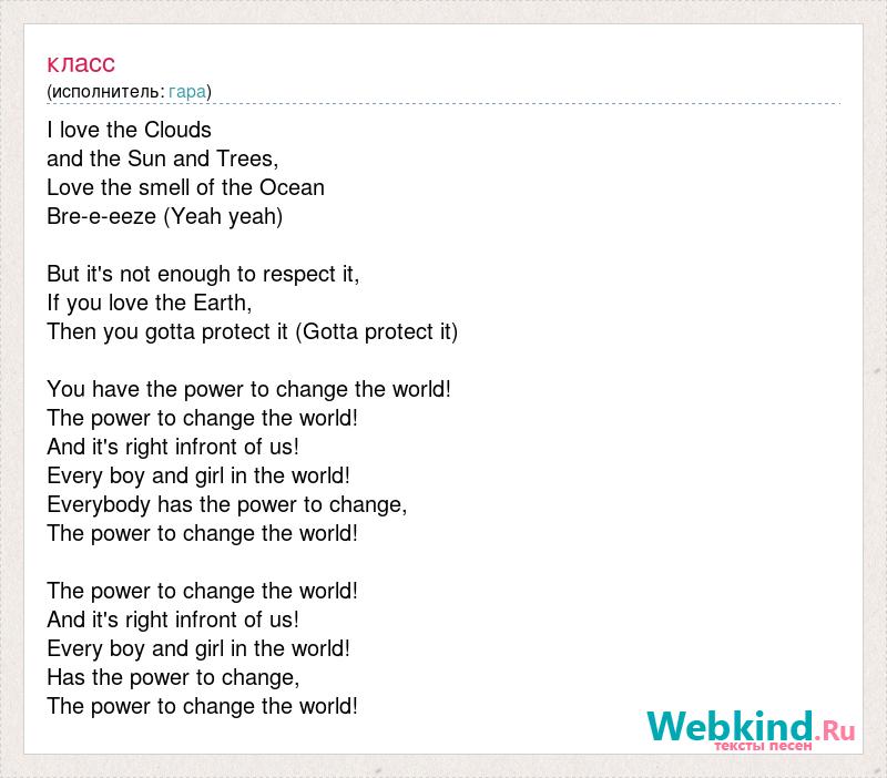 I love the Clouds and the Sun and Trees, Love the smell of the Ocean Bre-e-eeze (Yeah yeah) But it's not enough to respect it, If you love the Earth, Then you gotta protect it (Gotta protect it) You have the power to change the world! The power to change the world! And it's right infront of us! Every boy and girl in the world! Everybody has the power to change, The power to change the world! The power to change the world! And it's right infront of us! Every boy and girl in the world! Has the power to change, The power to change the world!