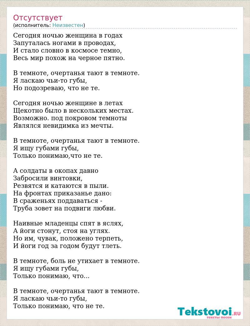Сегодня ночью женщина в годах Запуталась ногами в проводах, И стало словно в космосе темно, Весь мир похож на черное пятно. В темноте, очертанья тают в темноте. Я ласкаю чьи-то губы, Но подозреваю, что не те. Сегодня ночью женщине в летах Щекотно было в нескольких местах. Возможно. под покровом темноты Являлся невидимка из мечты. В темноте, очертанья тают в темноте. Я ищу губами губы, Только понимаю,что не те. А солдаты в окопах давно Забросили винтовки, Резвятся и катаются в пыли. На фронтах приказанье дано: В сраженьях поддаваться - Труба зовет на подвиги любви. Наивные младенцы спят в яслях, А йоги стонут, стоя на углях. Но им, чувак, положено терпеть, И йоги год за годом будут тлеть. В темноте, боль не утихает в темноте. Я ищу губами губы, Только понимаю, что... В темноте, очертанья тают в темноте. Я ласкаю чьи-то губы, Только понимаю, что не те.