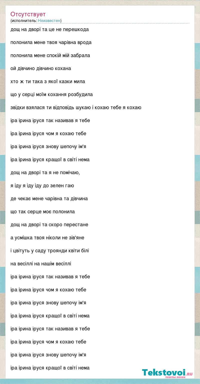 дощ на дворі та це не перешкода полонила мене твоя чарівна врода полонила мене спокій мій забрала ой дівчино дівчино кохана хто ж ти така з якої казки мила що у серці моїм кохання розбудила звідки взялася ти відповідь шукаю і кохаю тебе я кохаю іра ірина іруся так називав я тебе іра ірина іруся чом я кохаю тебе іра ірина іруся знову шепочу ім'я іра ірина іруся кращої в світі нема дощ на дворі та я не помічаю, я іду я іду іду до зелен гаю де чекає мене чарівна та дівчина що так cерце моє полонила дощ на дворі та скоро перестане а усмішка твоя ніколи не зів'яне і цвітуть у саду троянди квіти білі на весіллi на нашім весіллi іра ірина іруся так називав я тебе іра ірина іруся чом я кохаю тебе іра ірина іруся знову шепочу ім'я іра ірина іруся кращої в світі нема іра ірина іруся так називав я тебе іра ірина іруся чом я кохаю тебе іра ірина іруся знову шепочу ім'я іра ірина іруся кращої в світі нема