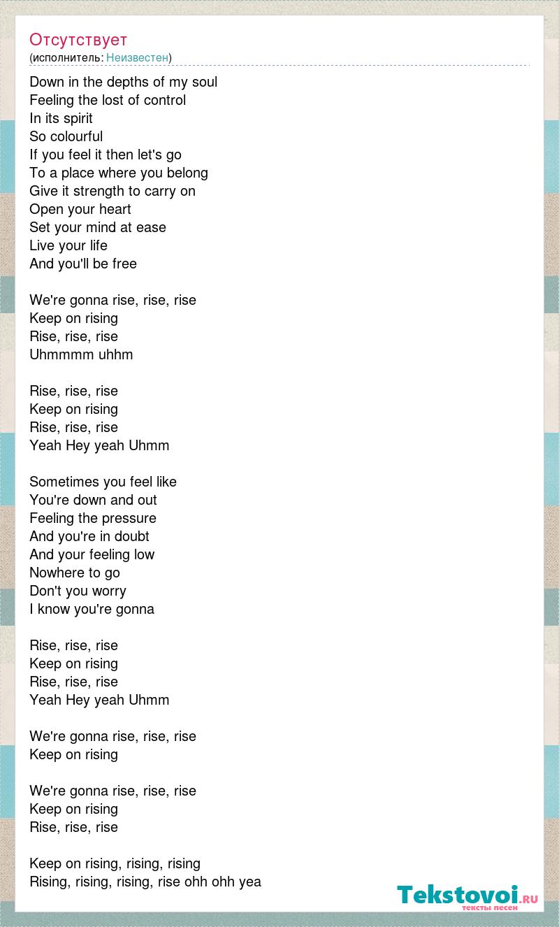 Down in the depths of my soul Feeling the lost of control In its spirit So colourful If you feel it then let's go To a place where you belong Give it strength to carry on Open your heart Set your mind at ease Live your life And you'll be free We're gonna rise, rise, rise Keep on rising Rise, rise, rise Uhmmmm uhhm Rise, rise, rise Keep on rising Rise, rise, rise Yeah Hey yeah Uhmm Sometimes you feel like You're down and out Feeling the pressure And you're in doubt And your feeling low Nowhere to go Don't you worry I know you're gonna Rise, rise, rise Keep on rising Rise, rise, rise Yeah Hey yeah Uhmm We're gonna rise, rise, rise Keep on rising We're gonna rise, rise, rise Keep on rising Rise, rise, rise Keep on rising, rising, rising Rising, rising, rising, rise ohh ohh yea