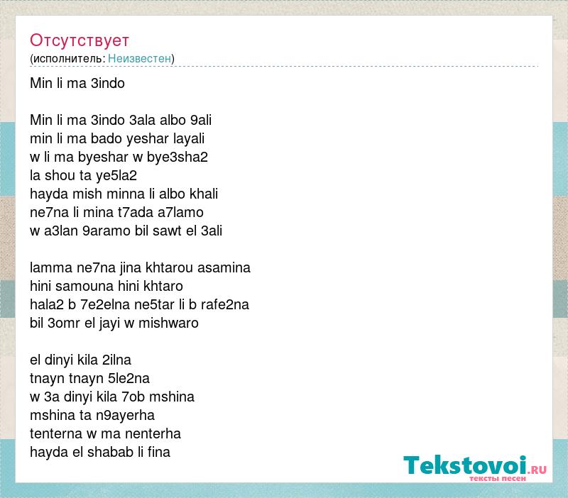 Min li ma 3indo Min li ma 3indo 3ala albo 9ali min li ma bado yeshar layali w li ma byeshar w bye3sha2 la shou ta ye5la2 hayda mish minna li albo khali ne7na li mina t7ada a7lamo w a3lan 9aramo bil sawt el 3ali lamma ne7na jina khtarou asamina hini samouna hini khtaro hala2 b 7e2elna ne5tar li b rafe2na bil 3omr el jayi w mishwaro el dinyi kila 2ilna tnayn tnayn 5le2na w 3a dinyi kila 7ob mshina mshina ta n9ayerha tenterna w ma nenterha hayda el shabab li fina