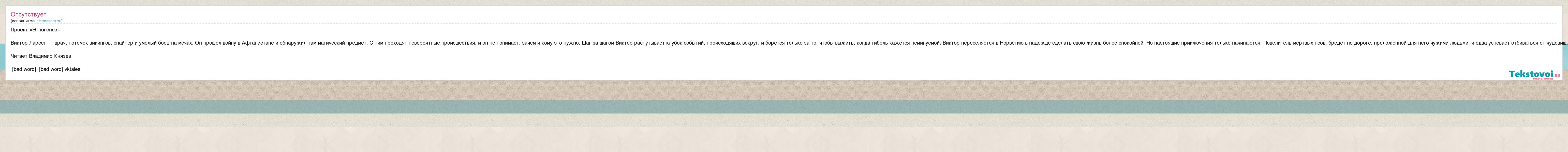 Проект «Этногенез» Виктор Ларсен — врач, потомок викингов, снайпер и умелый боец на мечах. Он прошел войну в Афганистане и обнаружил там магический предмет. С ним проходят невероятные происшествия, и он не понимает, зачем и кому это нужно. Шаг за шагом Виктор распутывает клубок событий, происходящих вокруг, и борется только за то, чтобы выжить, когда гибель кажется неминуемой. Виктор переселяется в Норвегию в надежде сделать свою жизнь более спокойной. Но настоящие приключения только начинаются. Повелитель мертвых псов, бредет по дороге, проложенной для него чужими людьми, и едва успевает отбиваться от чудовищ. Читает Владимир Князев [bad word] [bad word] vktales
