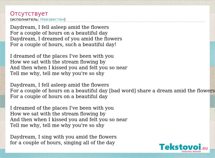 Daydream, I fell asleep amid the flowers For a couple of hours on a beautiful day Daydream, I dreamed of you amid the flowers For a couple of hours, such a beautiful day! I dreamed of the places I've been with you How we sat with the stream flowing by And then when I kissed you and felt you so near Tell me why, tell me why you're so shy Daydream, I fell asleep amid the flowers For a couple of hours on a beautiful day [bad word] share a dream amid the flowers For a couple of hours on a beautiful day I dreamed of the places I've been with you How we sat with the stream flowing by And then when I kissed you and felt you so near Tell me why, tell me why you're so shy Daydream, I sing with you amid the flowers for a couple of hours, singing all of the day