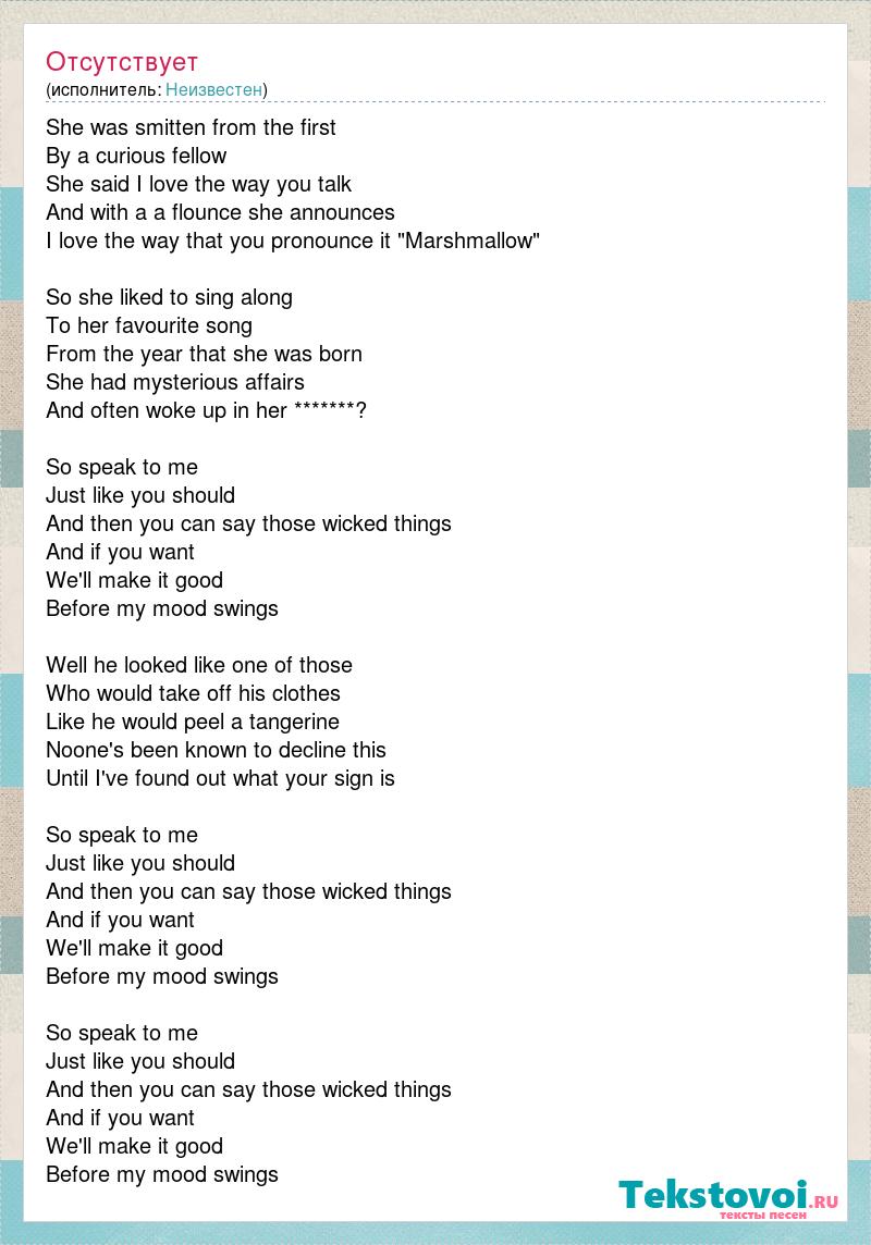 She was smitten from the first By a curious fellow She said I love the way you talk And with a a flounce she announces I love the way that you pronounce it "Marshmallow" So she liked to sing along To her favourite song From the year that she was born She had mysterious affairs And often woke up in her *******? So speak to me Just like you should And then you can say those wicked things And if you want We'll make it good Before my mood swings Well he looked like one of those Who would take off his clothes Like he would peel a tangerine Noone's been known to decline this Until I've found out what your sign is So speak to me Just like you should And then you can say those wicked things And if you want We'll make it good Before my mood swings So speak to me Just like you should And then you can say those wicked things And if you want We'll make it good Before my mood swings