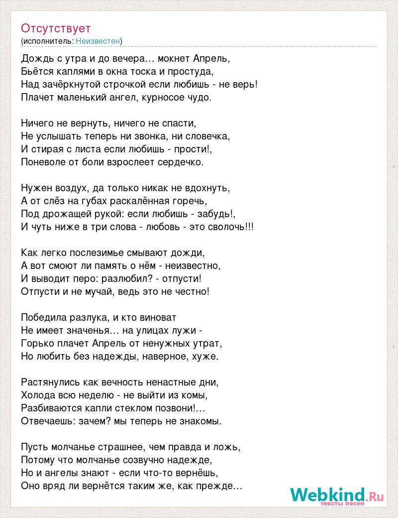 Дождь с утра и до вечера… мокнет Апрель, Бьётся каплями в окна тоска и простуда, Над зачёркнутой строчкой если любишь - не верь! Плачет маленький ангел, курносое чудо. Ничего не вернуть, ничего не спасти, Не услышать теперь ни звонка, ни словечка, И стирая с листа если любишь - прости!, Поневоле от боли взрослеет сердечко. Нужен воздух, да только никак не вдохнуть, А от слёз на губах раскалённая горечь, Под дрожащей рукой: если любишь - забудь!, И чуть ниже в три слова - любовь - это сволочь!!! Как легко послезимье смывают дожди, А вот смоют ли память о нём - неизвестно, И выводит перо: разлюбил? - отпусти! Отпусти и не мучай, ведь это не честно! Победила разлука, и кто виноват Не имеет значенья… на улицах лужи - Горько плачет Апрель от ненужных утрат, Но любить без надежды, наверное, хуже. Растянулись как вечность ненастные дни, Холода всю неделю - не выйти из комы, Разбиваются капли стеклом позвони!… Отвечаешь: зачем? мы теперь не знакомы. Пусть молчанье страшнее, чем правда и ложь, Потому что молчанье созвучно надежде, Но и ангелы знают - если что-то вернёшь, Оно вряд ли вернётся таким же, как прежде…