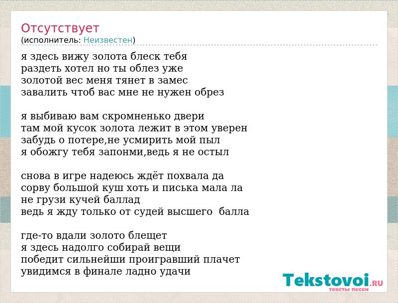 я здесь вижу золота блеск тебя раздеть хотел но ты облез уже золотой вес меня тянет в замес завалить чтоб вас мне не нужен обрез я выбиваю вам скромненько двери там мой кусок золота лежит в этом уверен забудь о потере,не усмирить мой пыл я обожгу тебя запонми,ведь я не остыл снова в игре надеюсь ждёт похвала да сорву большой куш хоть и писька мала ла не грузи кучей баллад ведь я жду только от судей высшего балла где-то вдали золото блещет я здесь надолго собирай вещи победит сильнейши проигравший плачет увидимся в финале ладно удачи