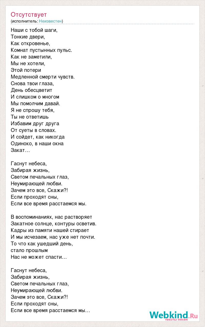 Наши с тобой шаги, Тонкие двери, Как откровенье, Комнат пустынных пульс. Как не заметили, Мы не хотели, Этой потери Медленной смерти чувств. Снова твои глаза, День обесцветит И слишком о многом Мы помолчим давай. Я не спрошу тебя, Ты не ответишь Избавим друг друга От суеты в словах. И сойдет, как никогда Одиноко, в наши окна Закат… Гаснут небеса, Забирая жизнь, Светом печальных глаз, Неумирающей любви. Зачем это все, Скажи?! Если проходят сны, Если все время расстаемся мы. В воспоминаниях, нас растворяет Закатное солнце, контуры осветив. Кадры из памяти нашей стирает И мы исчезаем, нас уже нет почти. То что как ушедший день, стало прошлым Нас не может спасти… Гаснут небеса, Забирая жизнь, Светом печальных глаз, Неумирающей любви. Зачем это все, Скажи?! Если проходят сны, Если все время расстаемся мы…