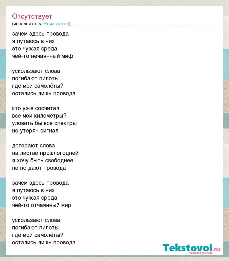 зачем здесь провода я путаюсь в них это чужая среда чей-то нечаянный миф ускользают слова погибают пилоты где мои самолёты? остались лишь провода кто уже сосчитал все мои километры? уловить бы все спектры но утерян сигнал догорают слова на листве прошлогодней я хочу быть свободнее но не дают провода зачем здесь провода я путаюсь в них это чужая среда чей-то отчаянный мир ускользают слова погибают пилоты где мои самолёты? остались лишь провода