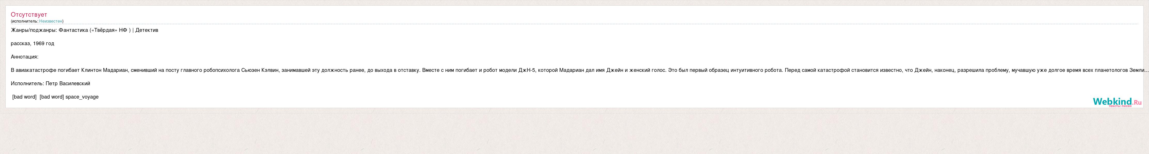 Жанры/поджанры: Фантастика («Твёрдая» НФ ) | Детектив рассказ, 1969 год Аннотация: В авиакатастрофе погибает Клинтон Мадариан, сменивший на посту главного робопсихолога Сьюзен Кэлвин, занимавшей эту должность ранее, до выхода в отставку. Вместе с ним погибает и робот модели ДжН-5, которой Мадариан дал имя Джейн и женский голос. Это был первый образец интуитивного робота. Перед самой катастрофой становится известно, что Джейн, наконец, разрешила проблему, мучавшую уже долгое время всех планетологов Земли... Исполнитель: Петр Василевский [bad word] [bad word] space_voyage