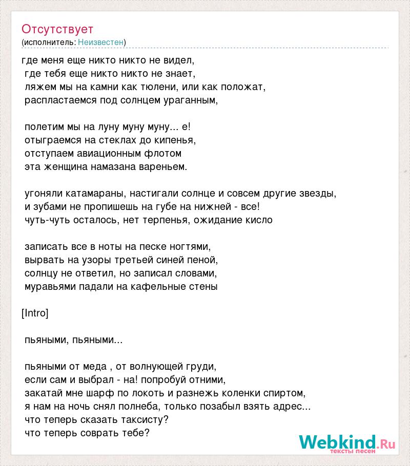 где меня еще никто никто не видел, где тебя еще никто никто не знает, ляжем мы на камни как тюлени, или как положат, распластаемся под солнцем ураганным, полетим мы на луну муну муну... е! отыграемся на стеклах до кипенья, отступаем авиационным флотом эта женщина намазана вареньем. угоняли катамараны, настигали солнце и совсем другие звезды, и зубами не пропишешь на губе на нижней - все! чуть-чуть осталось, нет терпенья, ожидание кисло записать все в ноты на песке ногтями, вырвать на узоры третьей синей пеной, солнцу не ответил, но записал словами, муравьями падали на кафельные стены [Intro] пьяными, пьяными... пьяными от меда , от волнующей груди, если сам и выбрал - на! попробуй отними, закатай мне шарф по локоть и разнежь коленки спиртом, я нам на ночь снял полнеба, только позабыл взять адрес... что теперь сказать таксисту? что теперь соврать тебе?