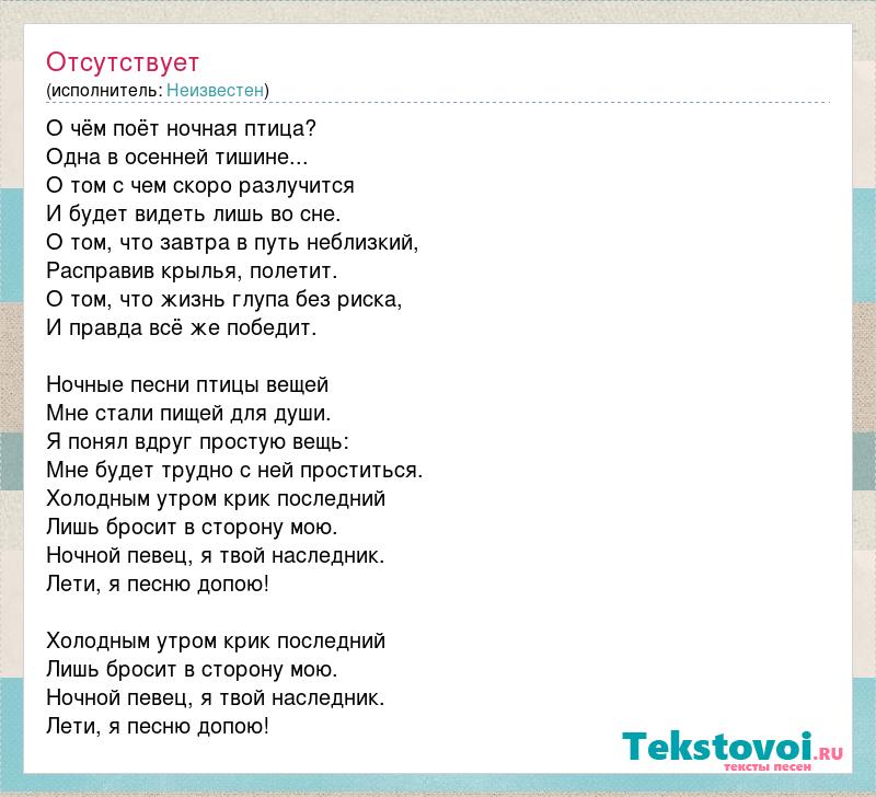 О чём поёт ночная птица? Одна в осенней тишине... О том с чем скоро разлучится И будет видеть лишь во сне. О том, что завтра в путь неблизкий, Расправив крылья, полетит. О том, что жизнь глупа без риска, И правда всё же победит. Ночные песни птицы вещей Мне стали пищей для души. Я понял вдруг простую вещь: Мне будет трудно с ней проститься. Холодным утром крик последний Лишь бросит в сторону мою. Ночной певец, я твой наследник. Лети, я песню допою! Холодным утром крик последний Лишь бросит в сторону мою. Ночной певец, я твой наследник. Лети, я песню допою!
