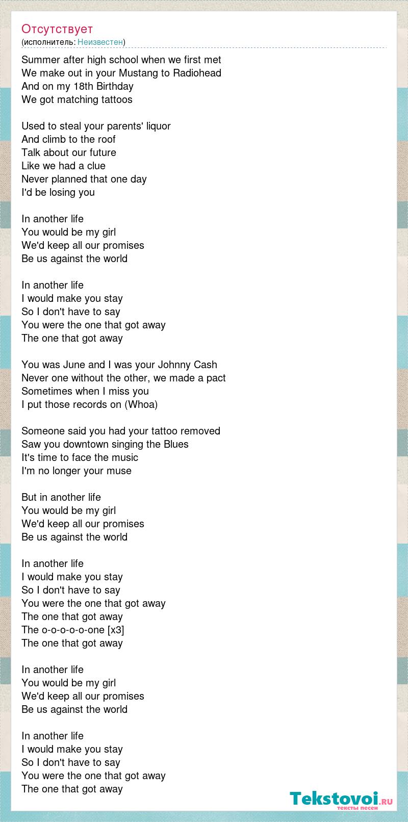 Summer after high school when we first met We make out in your Mustang to Radiohead And on my 18th Birthday We got matching tattoos Used to steal your parents' liquor And climb to the roof Talk about our future Like we had a clue Never planned that one day I'd be losing you In another life You would be my girl We'd keep all our promises Be us against the world In another life I would make you stay So I don't have to say You were the one that got away The one that got away You was June and I was your Johnny Cash Never one without the other, we made a pact Sometimes when I miss you I put those records on (Whoa) Someone said you had your tattoo removed Saw you downtown singing the Blues It's time to face the music I'm no longer your muse But in another life You would be my girl We'd keep all our promises Be us against the world In another life I would make you stay So I don't have to say You were the one that got away The one that got away The o-o-o-o-o-one [x3] The one that got away In another life You would be my girl We'd keep all our promises Be us against the world In another life I would make you stay So I don't have to say You were the one that got away The one that got away