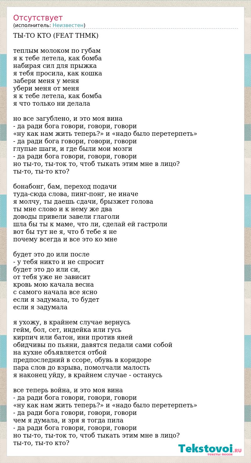 ТЫ-ТО КТО (FEAT ТНМК) теплым молоком по губам я к тебе летела, как бомба набирая сил для прыжка я тебя просила, как кошка забери меня у меня убери меня от меня я к тебе летела, как бомба я что только ни делала но все загублено, и это моя вина - да ради бога говори, говори, говори «ну как нам жить теперь?» и «надо было перетерпеть» - да ради бога говори, говори, говори глупые шаги, и где были мои мозги - да ради бога говори, говори, говори но ты-то, ты-ток то, чтоб тыкать этим мне в лицо? ты-то, ты-то кто? бонабонг, бам, переход подачи туда-сюда слова, пинг-понг, не иначе я молчу, ты даешь сдачи, брызжет голова ты мне слово и к нему же два доводы привели завели глаголи шла бы ты к маме, что ли, сделай ей гастроли вот бы тут не я, что б тебе я не почему всегда и все это ко мне будет это до или после - у тебя никто и не спросит будет это до или си, от тебя уже не зависит кровь мою качала весна с самого начала все ясно если я задумала, то будет если я задумала я ухожу, в крайнем случае вернусь гейм, бол, сет, индейка или гусь кирпич или батон, ини против яней обидчивы по пьяни, давятся педали сами собой на кухне объявляется отбой предпоследний в ссоре, обувь в коридоре пара слов до взрыва, помолчали малость я наконец уйду, в крайнем случае - останусь все теперь война, и это моя вина - да ради бога говори, говори, говори «ну как нам жить теперь?» и «надо было перетерпеть» - да ради бога говори, говори, говори чем я думала, и зря я тогда пила - да ради бога говори, говори, говори но ты-то, ты-ток то, чтоб тыкать этим мне в лицо? ты-то, ты-то кто?