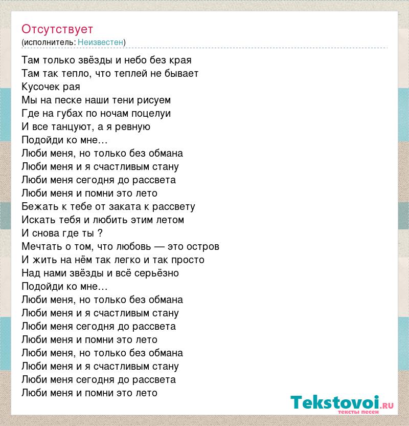 Там только звёзды и небо без края Там так тепло, что теплей не бывает Кусочек рая Мы на песке наши тени рисуем Где на губах по ночам поцелуи И все танцуют, а я ревную Подойди ко мне… Люби меня, но только без обмана Люби меня и я счастливым стану Люби меня сегодня до рассвета Люби меня и помни это лето Бежать к тебе от заката к рассвету Искать тебя и любить этим летом И снова где ты ? Мечтать о том, что любовь — это остров И жить на нём так легко и так просто Над нами звёзды и всё серьёзно Подойди ко мне… Люби меня, но только без обмана Люби меня и я счастливым стану Люби меня сегодня до рассвета Люби меня и помни это лето Люби меня, но только без обмана Люби меня и я счастливым стану Люби меня сегодня до рассвета Люби меня и помни это лето