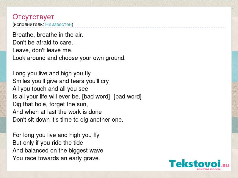 Breathe, breathe in the air. Don't be afraid to care. Leave, don't leave me. Look around and choose your own ground. Long you live and high you fly Smiles you'll give and tears you'll cry All you touch and all you see Is all your life will ever be. [bad word] [bad word] Dig that hole, forget the sun, And when at last the work is done Don't sit down it's time to dig another one. For long you live and high you fly But only if you ride the tide And balanced on the biggest wave You race towards an early grave.