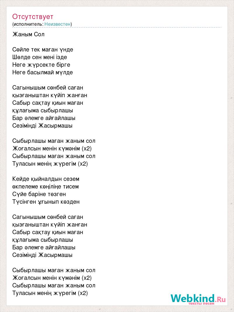 Жаным Сол Сөйле тек маған үнде Шөлде сен мені ізде Неге жүрсекте бірге Неге басылмай мүлде Сагынышым сөнбей саған қызғаныштан күйіп жанған Сабыр сақтау қиын маған құлағыма сыбырлашы Бар әлемге айғайлашы Сезіміңді Жасырмашы Сыбырлашы маған жаным сол Жоғалсын менін күмәнім (x2) Сыбырлашы маған жаным сол Туласын менің жүрегім (x2) Кейде қыйналдын сезем өкпелеме көңіліңе тисем Сүйе баріне төзген Түсінген ұғынып көзден Сагынышым сөнбей саған қызғаныштан күйіп жанған Сабыр сақтау қиын маған құлағыма сыбырлашы Бар әлемге айғайлашы Сезіміңді Жасырмашы Сыбырлашы маған жаным сол Жоғалсын менін күмәнім (x2) Сыбырлашы маған жаным сол Туласын менің жүрегім (x2)