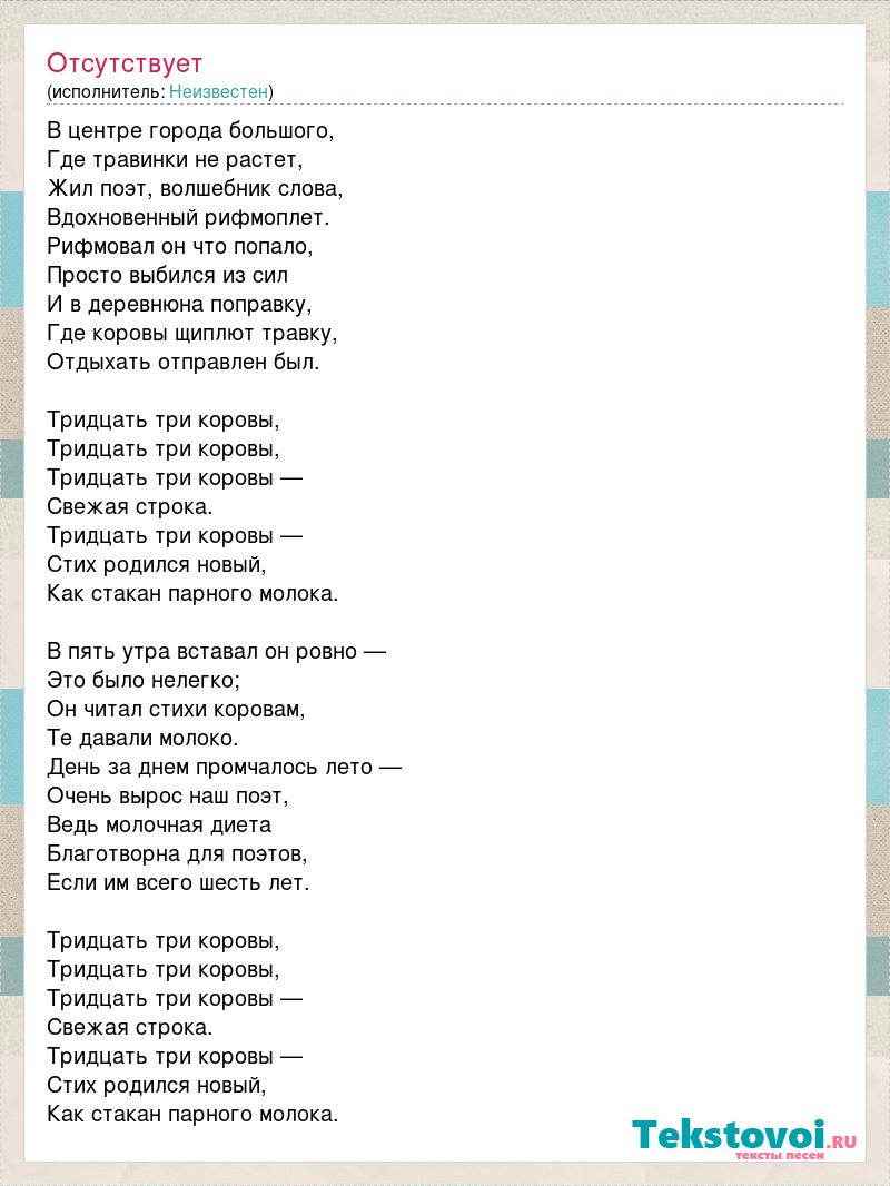 В центре города большого, Где травинки не растет, Жил поэт, волшебник слова, Вдохновенный рифмоплет. Рифмовал он что попало, Просто выбился из сил И в деревнюна поправку, Где коровы щиплют травку, Отдыхать отправлен был. Тридцать три коровы, Тридцать три коровы, Тридцать три коровы — Свежая строка. Тридцать три коровы — Стих родился новый, Как стакан парного молока. В пять утра вставал он ровно — Это было нелегко; Он читал стихи коровам, Те давали молоко. День за днем промчалось лето — Очень вырос наш поэт, Ведь молочная диета Благотворна для поэтов, Если им всего шесть лет. Тридцать три коровы, Тридцать три коровы, Тридцать три коровы — Свежая строка. Тридцать три коровы — Стих родился новый, Как стакан парного молока.