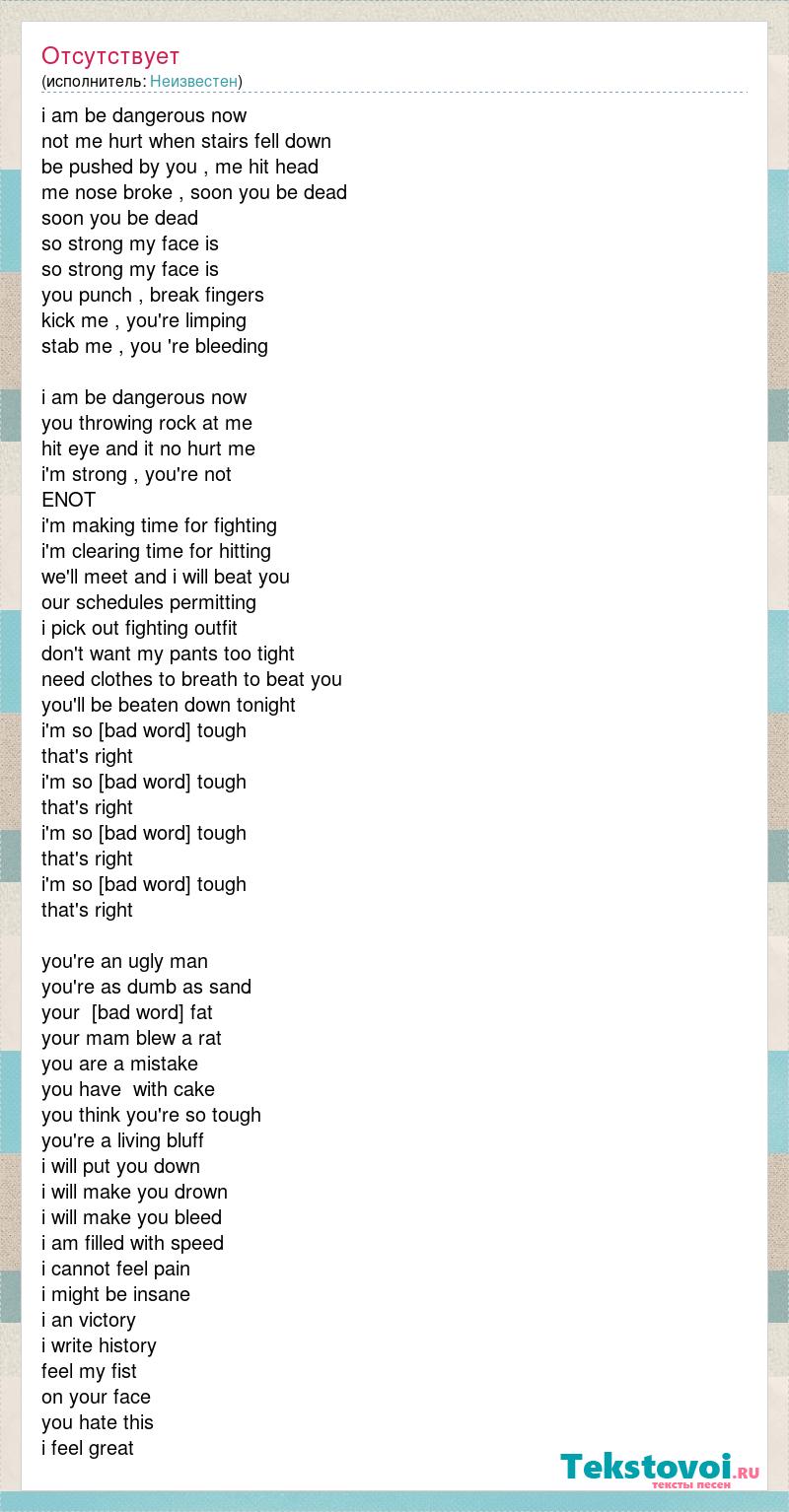 i am be dangerous now not me hurt when stairs fell down be pushed by you , me hit head me nose broke , soon you be dead soon you be dead so strong my face is so strong my face is you punch , break fingers kick me , you're limping stab me , you 're bleeding i am be dangerous now you throwing rock at me hit eye and it no hurt me i'm strong , you're not ENOT i'm making time for fighting i'm clearing time for hitting we'll meet and i will beat you our schedules permitting i pick out fighting outfit don't want my pants too tight need clothes to breath to beat you you'll be beaten down tonight i'm so [bad word] tough that's right i'm so [bad word] tough that's right i'm so [bad word] tough that's right i'm so [bad word] tough that's right you're an ugly man you're as dumb as sand your [bad word] fat your mam blew a rat you are a mistake you have with cake you think you're so tough you're a living bluff i will put you down i will make you drown i will make you bleed i am filled with speed i cannot feel pain i might be insane i an victory i write history feel my fist on your face you hate this i feel great