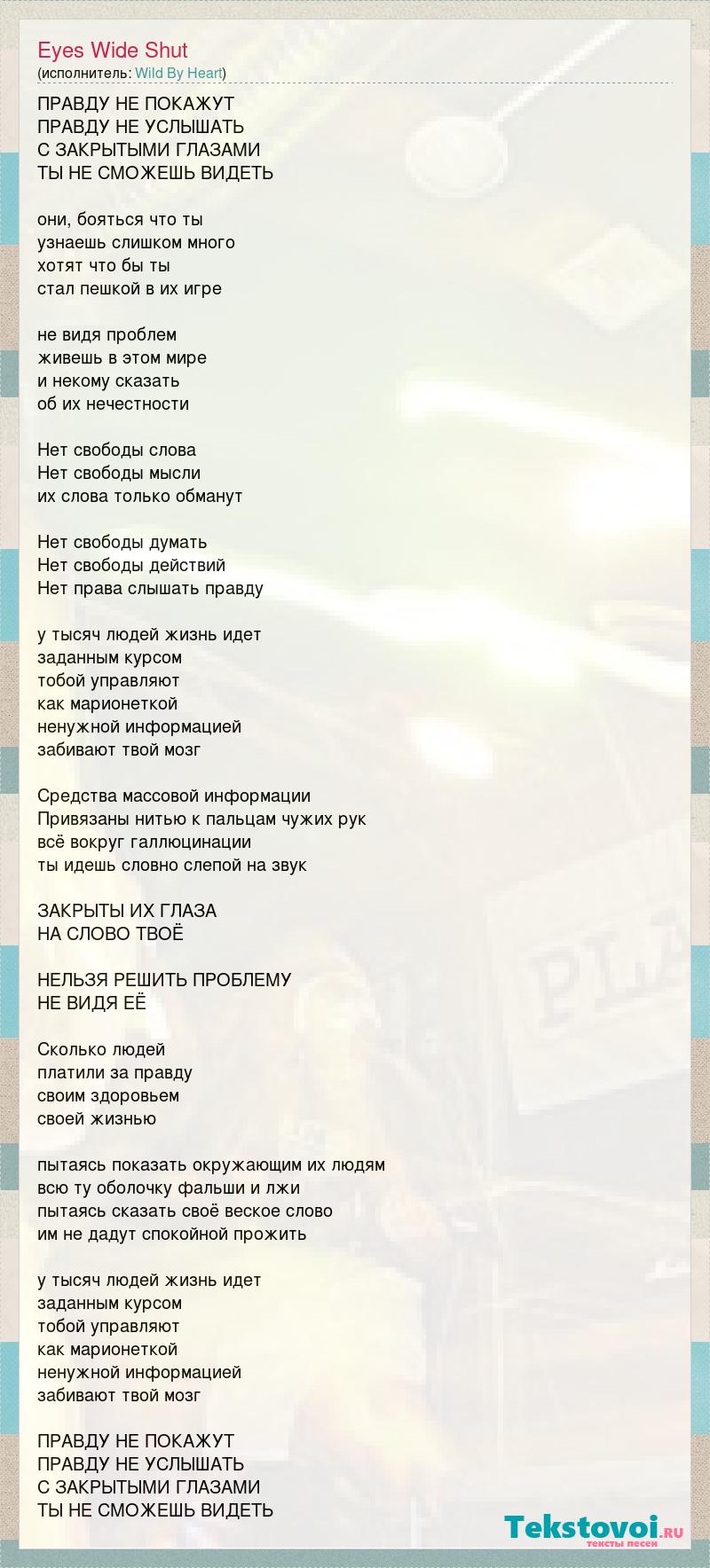 ПРАВДУ НЕ ПОКАЖУТ ПРАВДУ НЕ УСЛЫШАТЬ С ЗАКРЫТЫМИ ГЛАЗАМИ ТЫ НЕ СМОЖЕШЬ ВИДЕТЬ они, бояться что ты узнаешь слишком много хотят что бы ты стал пешкой в их игре не видя проблем живешь в этом мире и некому сказать об их нечестности Нет свободы слова Нет свободы мысли их слова только обманут Нет свободы думать Нет свободы действий Нет права слышать правду у тысяч людей жизнь идет заданным курсом тобой управляют как марионеткой ненужной информацией забивают твой мозг Средства массовой информации Привязаны нитью к пальцам чужих рук всё вокруг галлюцинации ты идешь словно слепой на звук ЗАКРЫТЫ ИХ ГЛАЗА НА СЛОВО ТВОЁ НЕЛЬЗЯ РЕШИТЬ ПРОБЛЕМУ НЕ ВИДЯ ЕЁ Сколько людей платили за правду своим здоровьем своей жизнью пытаясь показать окружающим их людям всю ту оболочку фальши и лжи пытаясь сказать своё веское слово им не дадут спокойной прожить у тысяч людей жизнь идет заданным курсом тобой управляют как марионеткой ненужной информацией забивают твой мозг ПРАВДУ НЕ ПОКАЖУТ ПРАВДУ НЕ УСЛЫШАТЬ С ЗАКРЫТЫМИ ГЛАЗАМИ ТЫ НЕ СМОЖЕШЬ ВИДЕТЬ