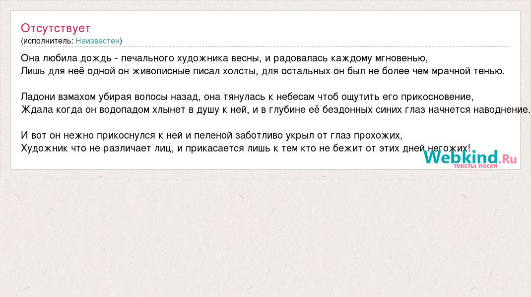 Она любила дождь - печального художника весны, и радовалась каждому мгновенью, Лишь для неё одной он живописные писал холсты, для остальных он был не более чем мрачной тенью. Ладони взмахом убирая волосы назад, она тянулась к небесам чтоб ощутить его прикосновение, Ждала когда он водопадом хлынет в душу к ней, и в глубине её бездонных синих глаз начнется наводнение. И вот он нежно прикоснулся к ней и пеленой заботливо укрыл от глаз прохожих, Художник что не различает лиц, и прикасается лишь к тем кто не бежит от этих дней негожих!